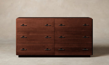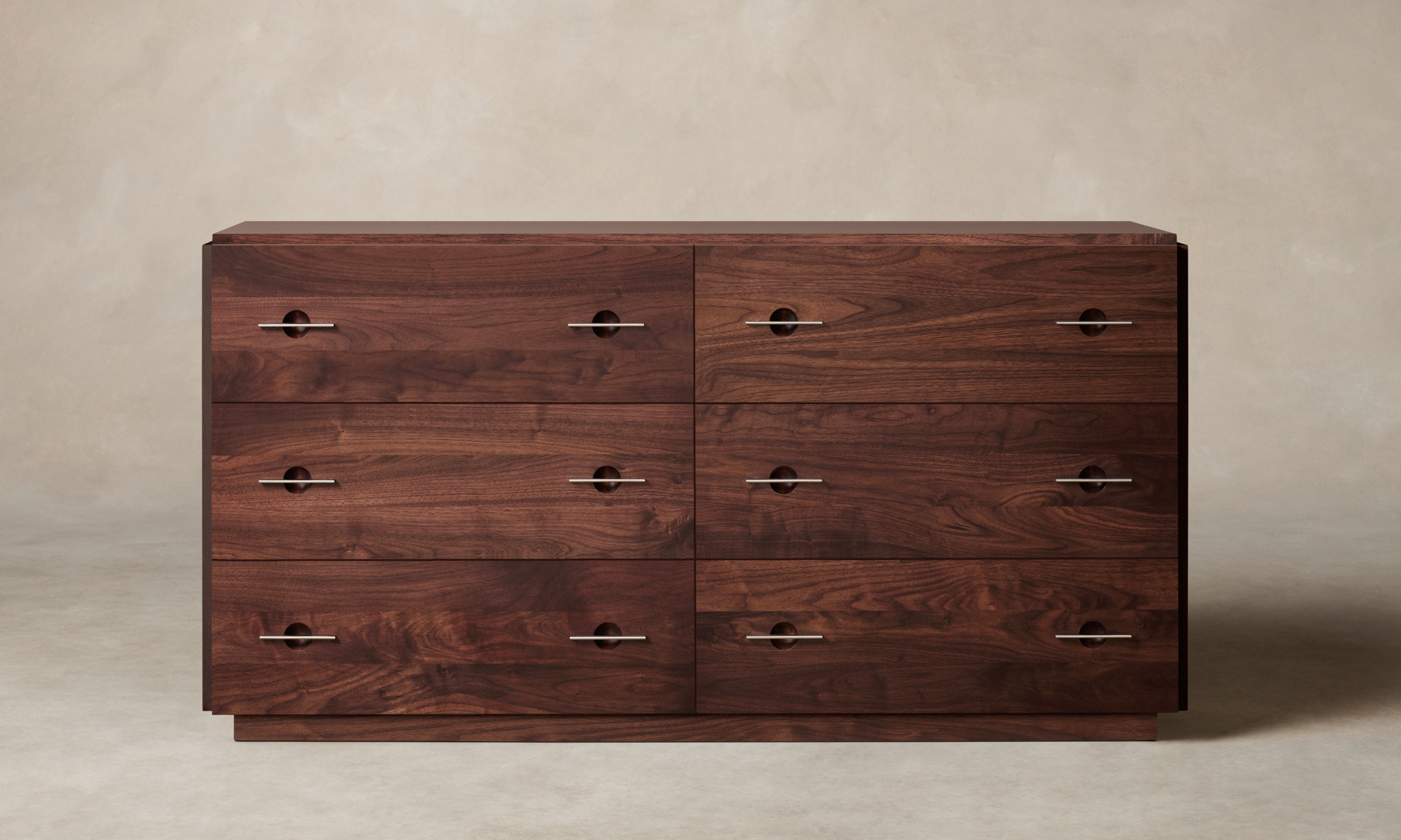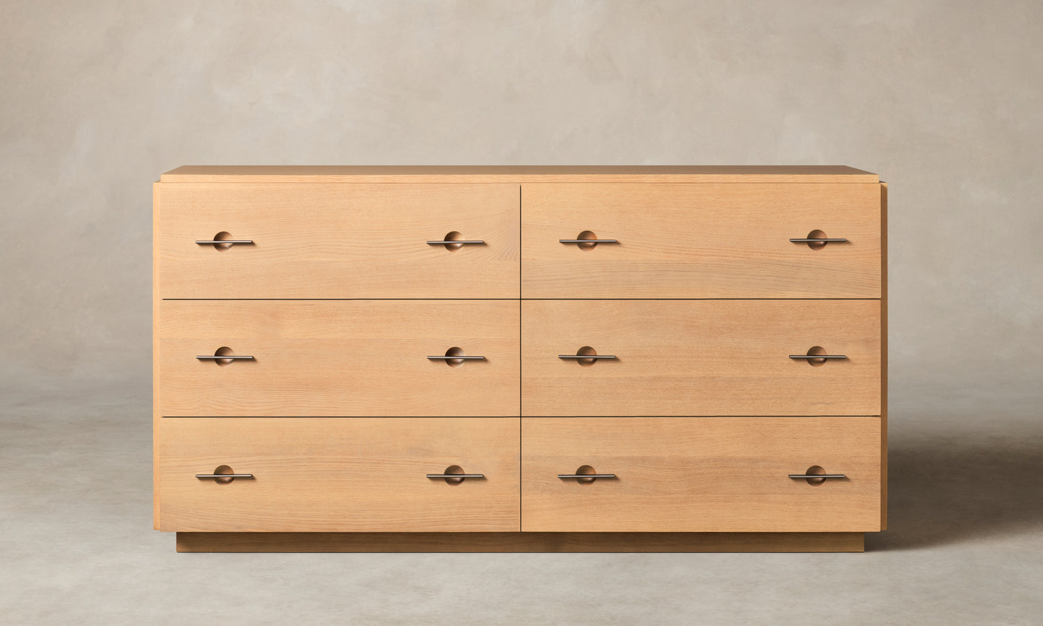Clean and geometric in form, the Aubrey 6-Drawer Dresser is imbued with Brazilian modernist influences. Made from white oak or walnut, it has circular cutouts and linear steel pulls. Handcrafted at a family-owned workroom in upstate New York.