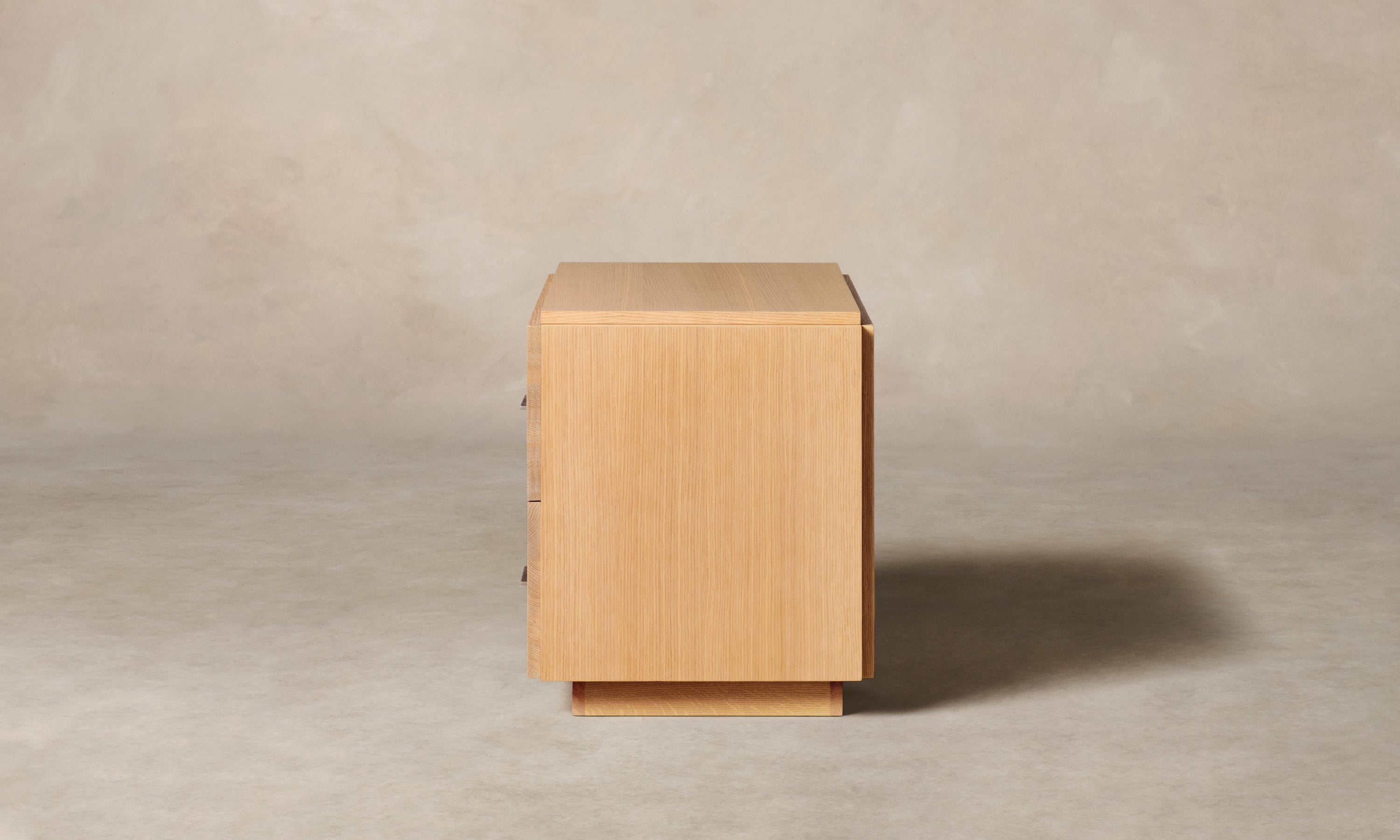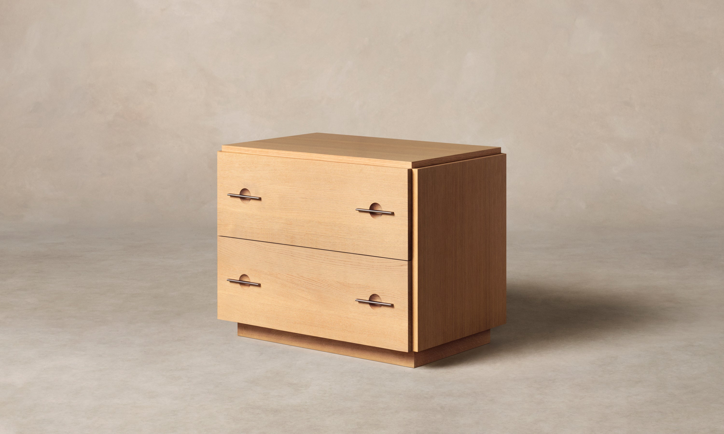Clean and geometric in form, the Aubrey Large 2-Drawer Nightstand is imbued with Brazilian modernist influences. Made from white oak or walnut, it has circular cutouts and linear steel pulls. Handcrafted at a family-owned workroom in upstate New York.