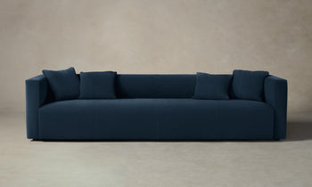 The Breuer Sofa draws inspiration from the bold and graphic shapes of brutalist design. Tightly upholstered for a sleek look, it has a low-lying seat accompanied by plush throw pillows. Handcrafted in North Carolina.