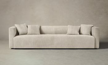 The Breuer Sofa draws inspiration from the bold and graphic shapes of brutalist design. Tightly upholstered for a sleek look, it has a low-lying seat accompanied by plush throw pillows. Handcrafted in North Carolina.
