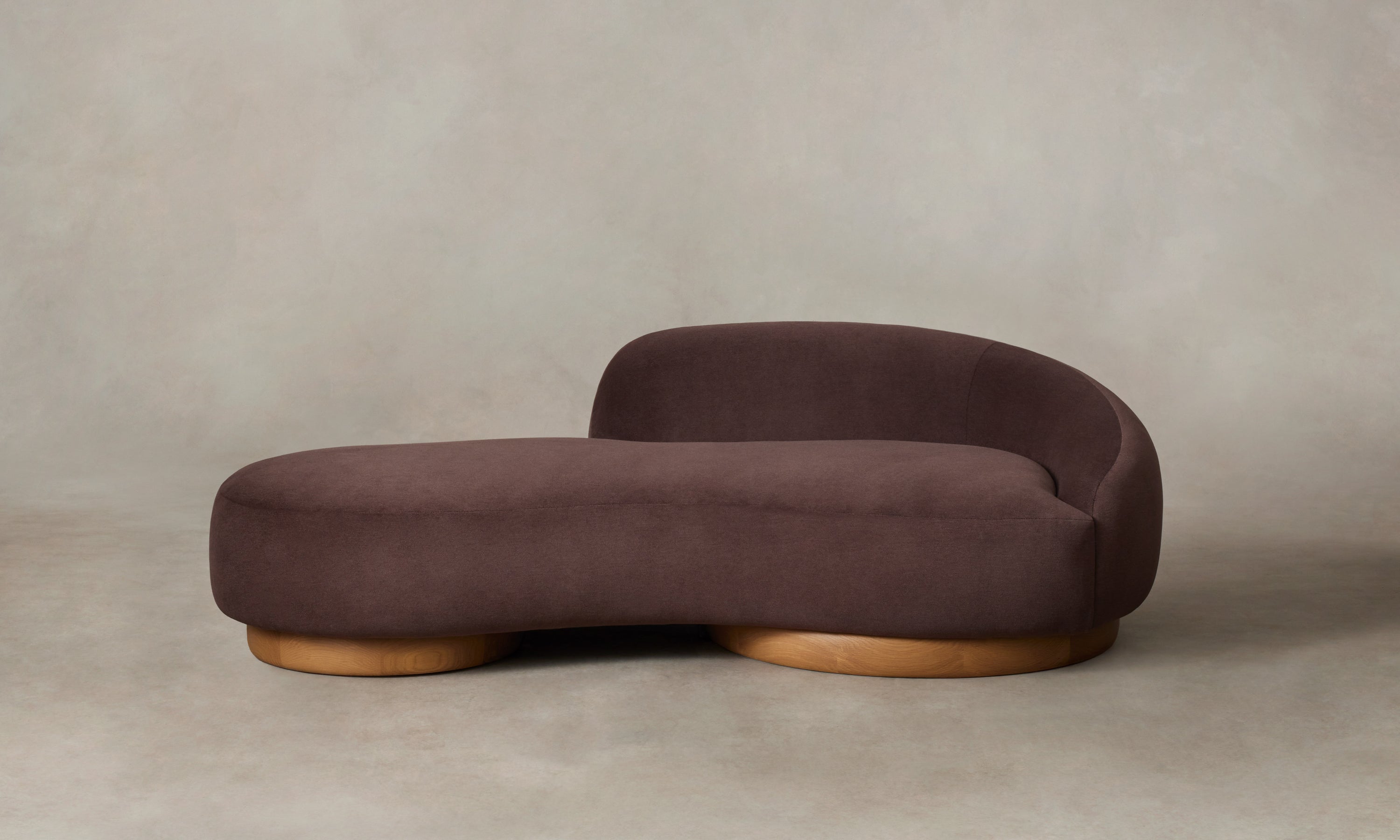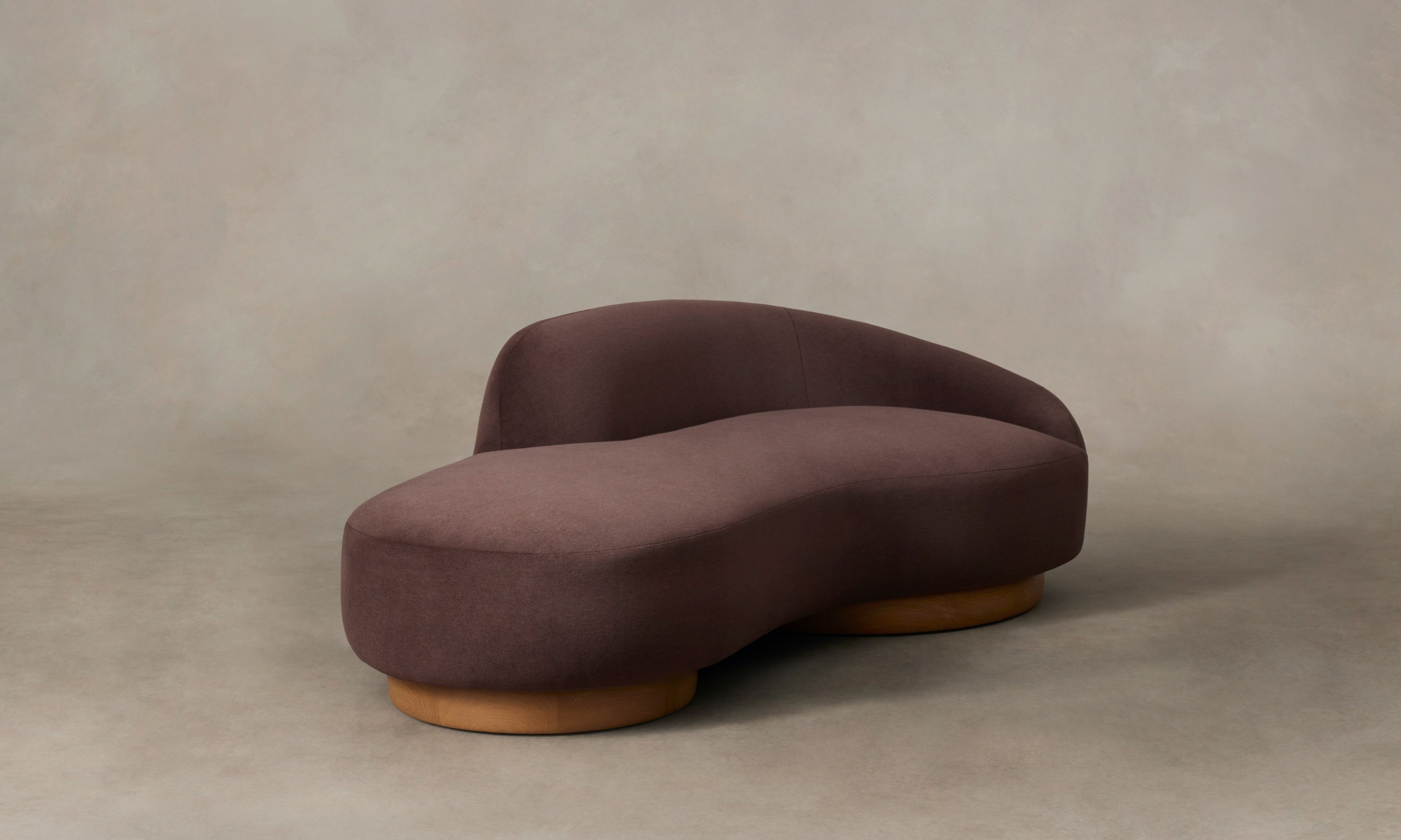 The Celine Sofa's organic form draws on natural elements—a stone softened by a river, a water droplet falling, or a sand dune undulating. It has one arm that tapers at the side and a curved seat that rests upon rounded white oak bases. Handcrafted in North Carolina.