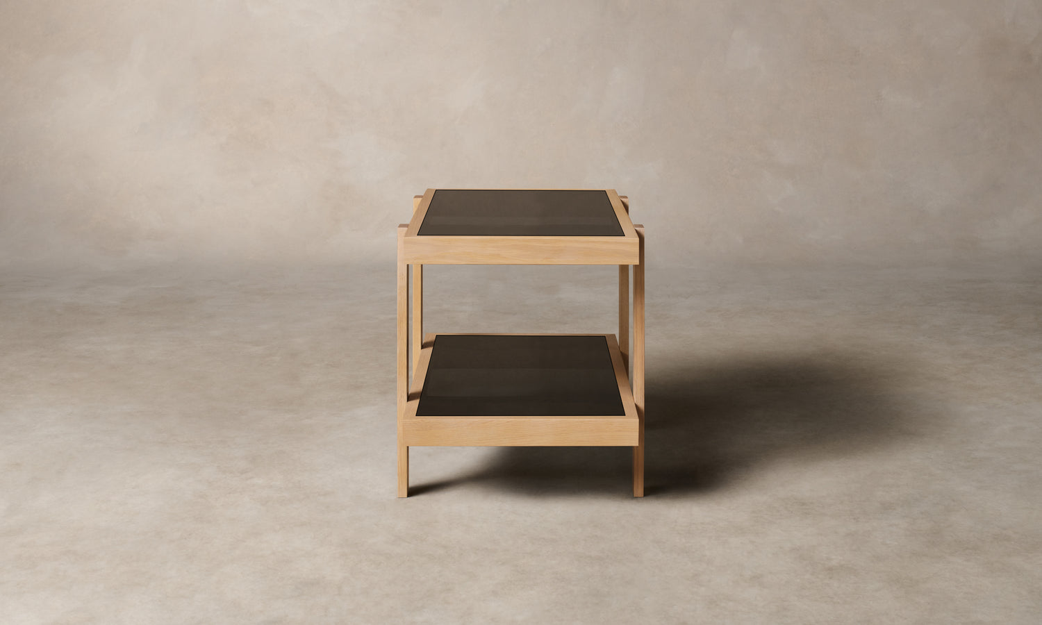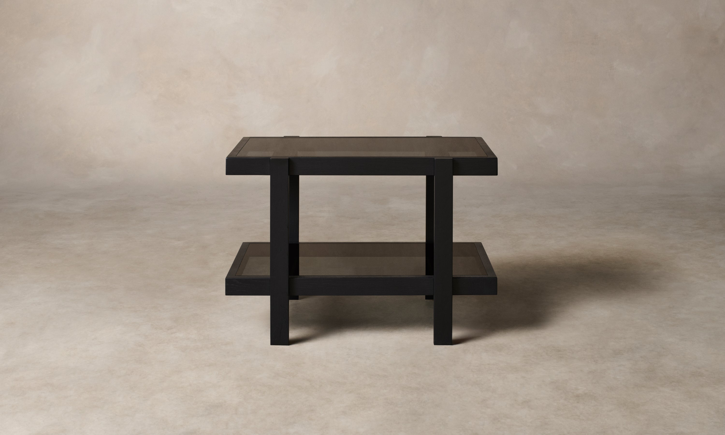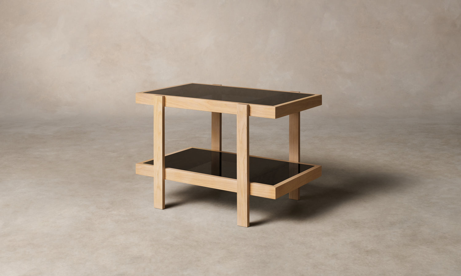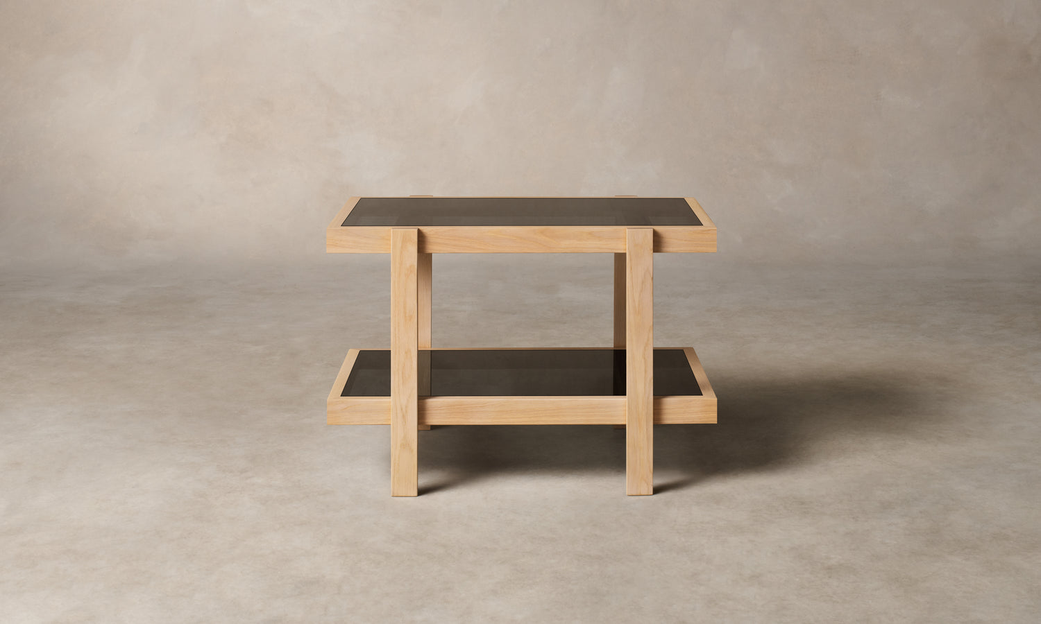 The Cleo Large Side Table exudes mid-century modern sophistication with its angular white oak frame and tinted glass inset, designed to invite quiet conversation between positive and negative space. Handcrafted in New York.