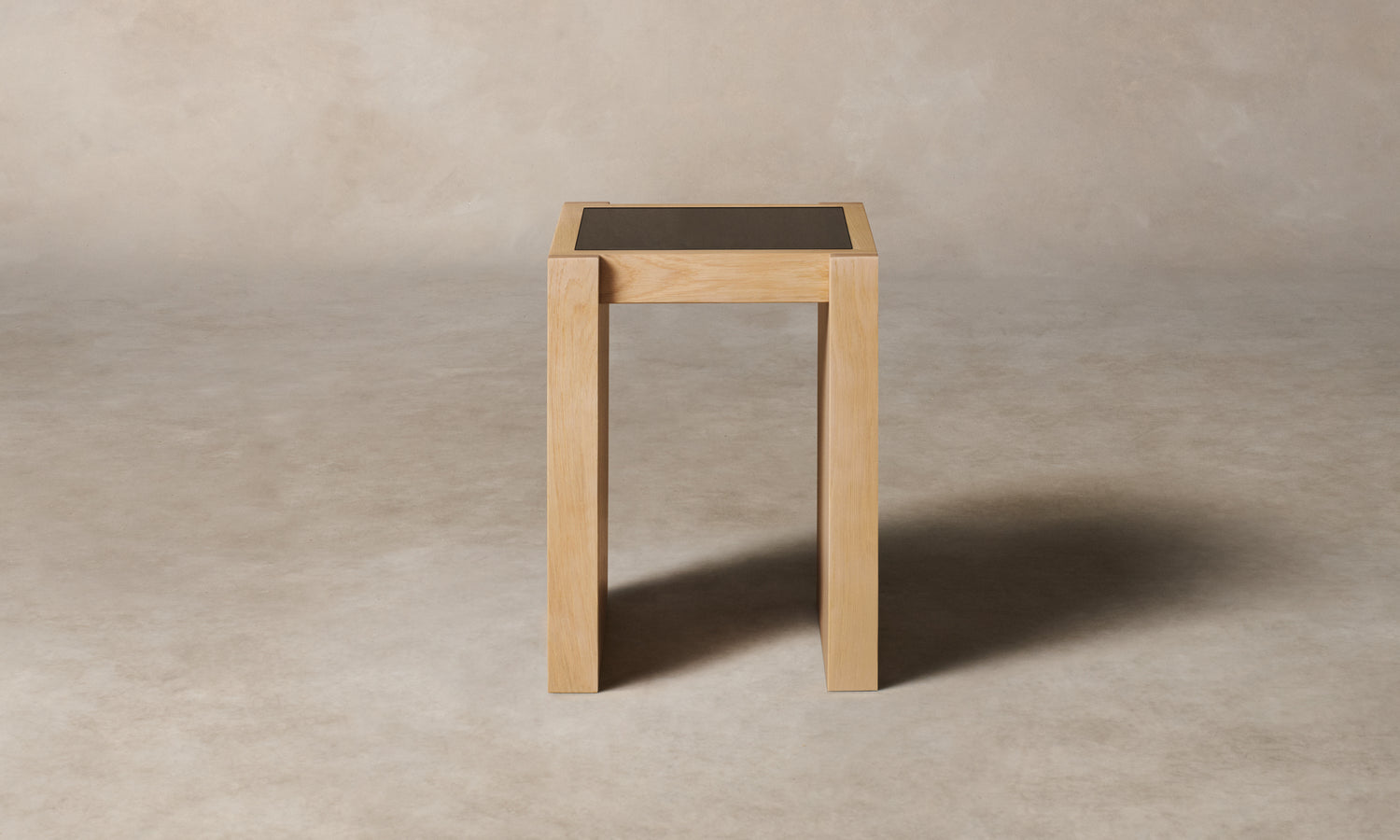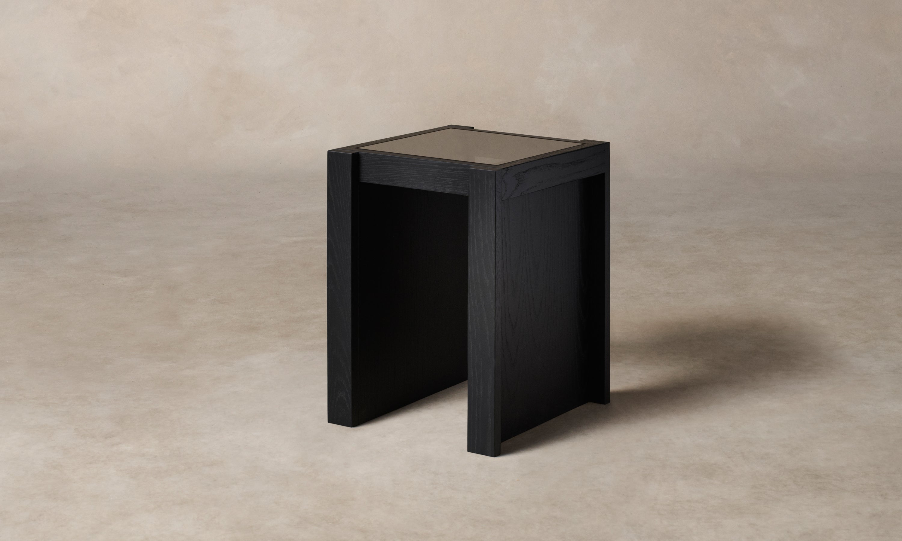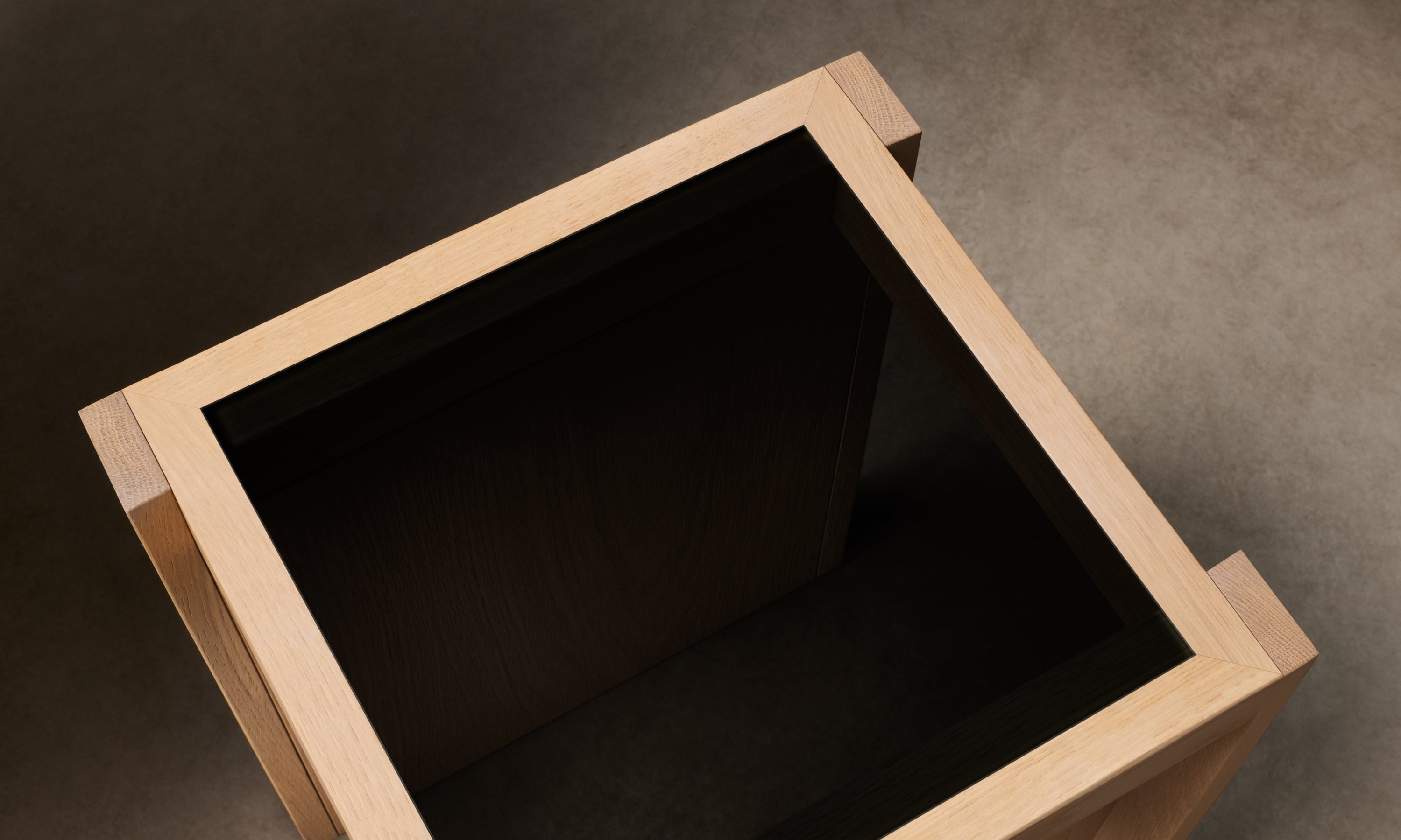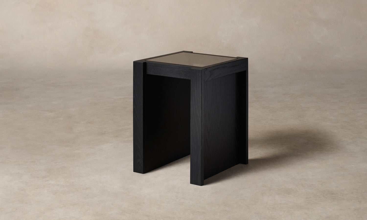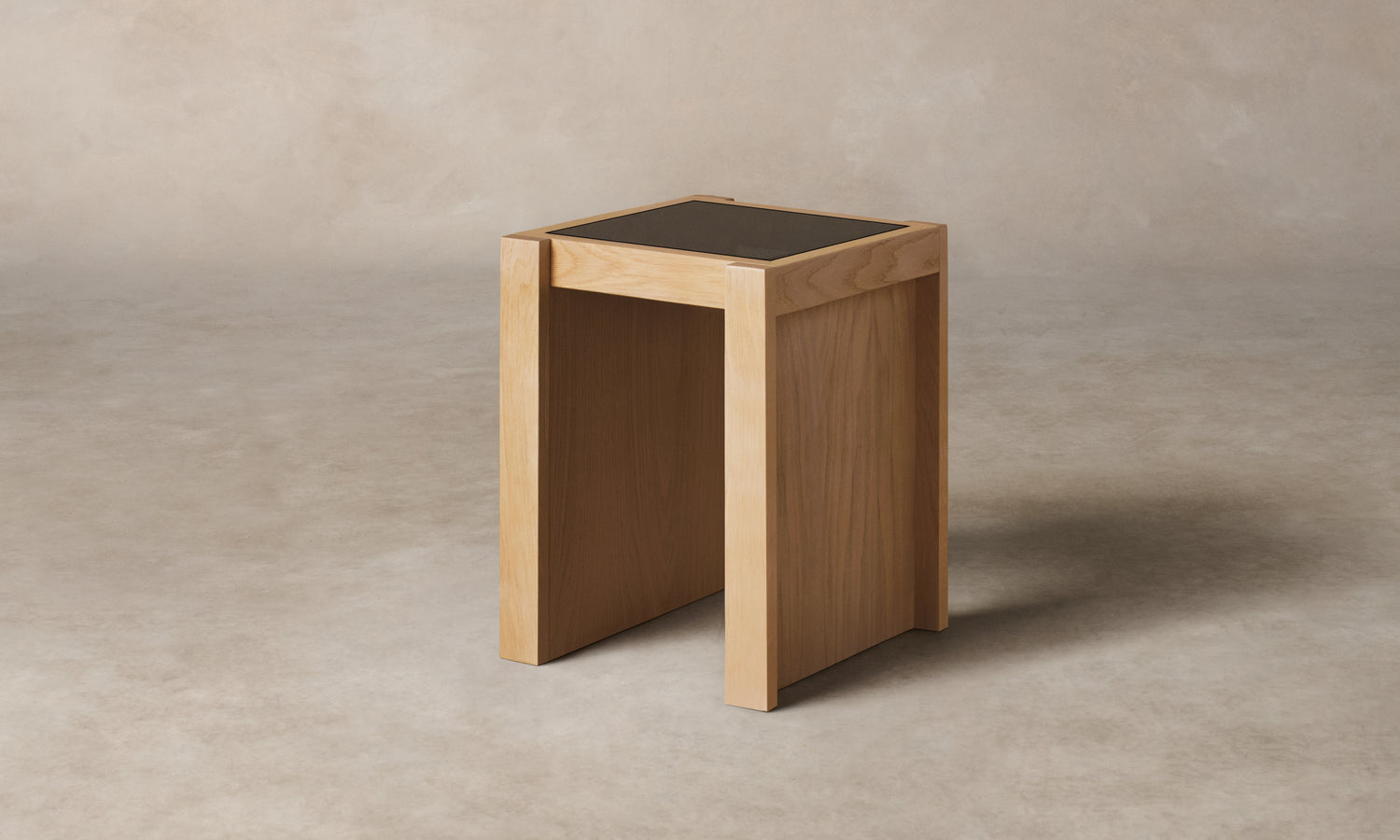 The Cleo Small Side Table exudes mid-century modern sophistication with its angular white oak frame and tinted glass inset, designed to invite quiet conversation between positive and negative space. Handcrafted in New York.