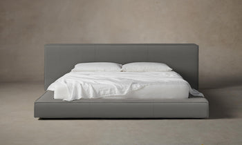The Eldridge Bed establishes a laid-back ambience in the bedroom with its low-lying silhouette and generous proportions. Fully upholstered and cushioned all around, it has an extended headboard and linear form traced with flange seams. Handcrafted in North Carolina.