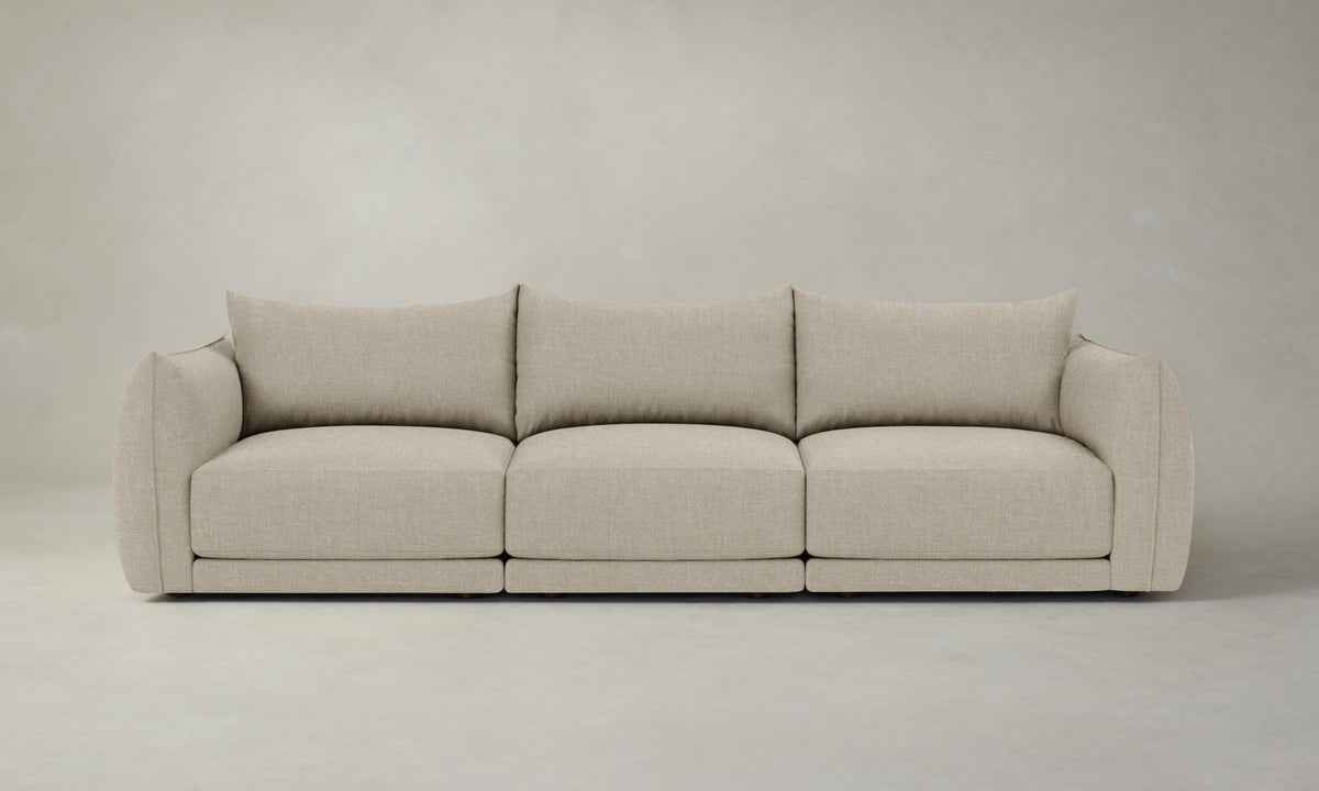 The Jones Sectional's low-lying, modular design recalls silhouettes from the 1970s. It has voluminous cushions and plush arms complete with flange seams for a tailored finish. Handcrafted in North Carolina.