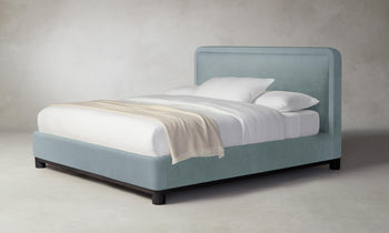 The Kent Bed’s rounded geometries create a sense of softness and tranquility. The design is tightly upholstered to emphasize its curved corners and foot rail, and it sits atop a plinth base with lathe-turned legs. Handcrafted in North Carolina.