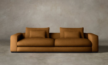 Marrying Italian modernist form with enveloping comfort, the Nicola Sofa invites total relaxation. It has a low back with plush down cushions supported by bolsters and rests atop a sleek plinth base. Handcrafted in North Carolina.