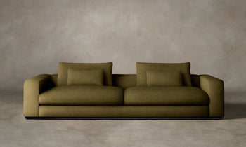 Marrying Italian modernist form with enveloping comfort, the Nicola Sofa invites total relaxation. It has a low back with plush down cushions supported by bolsters and rests atop a sleek plinth base. Handcrafted in North Carolina.