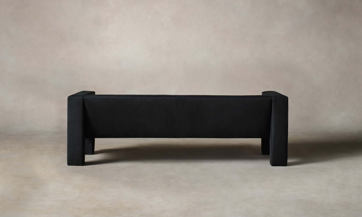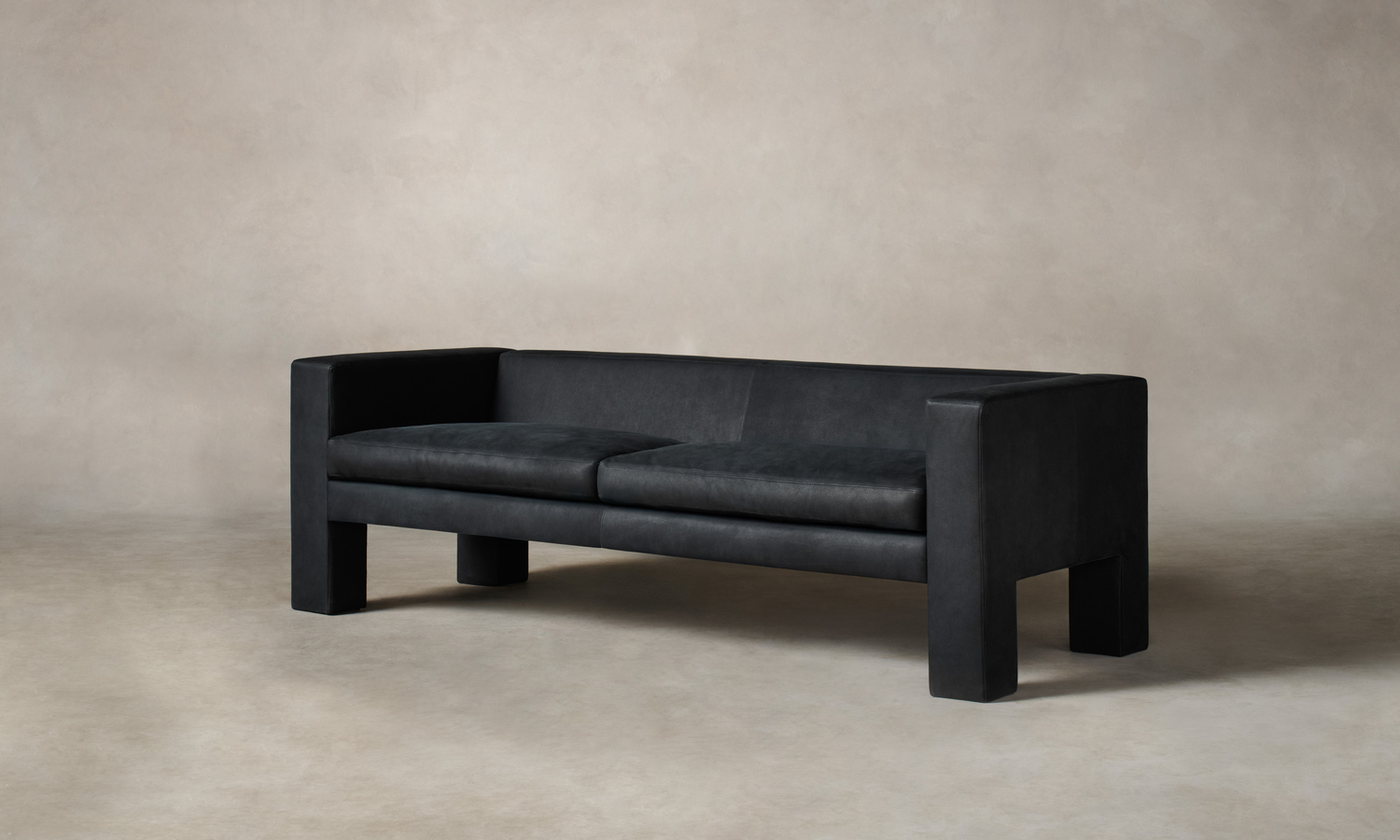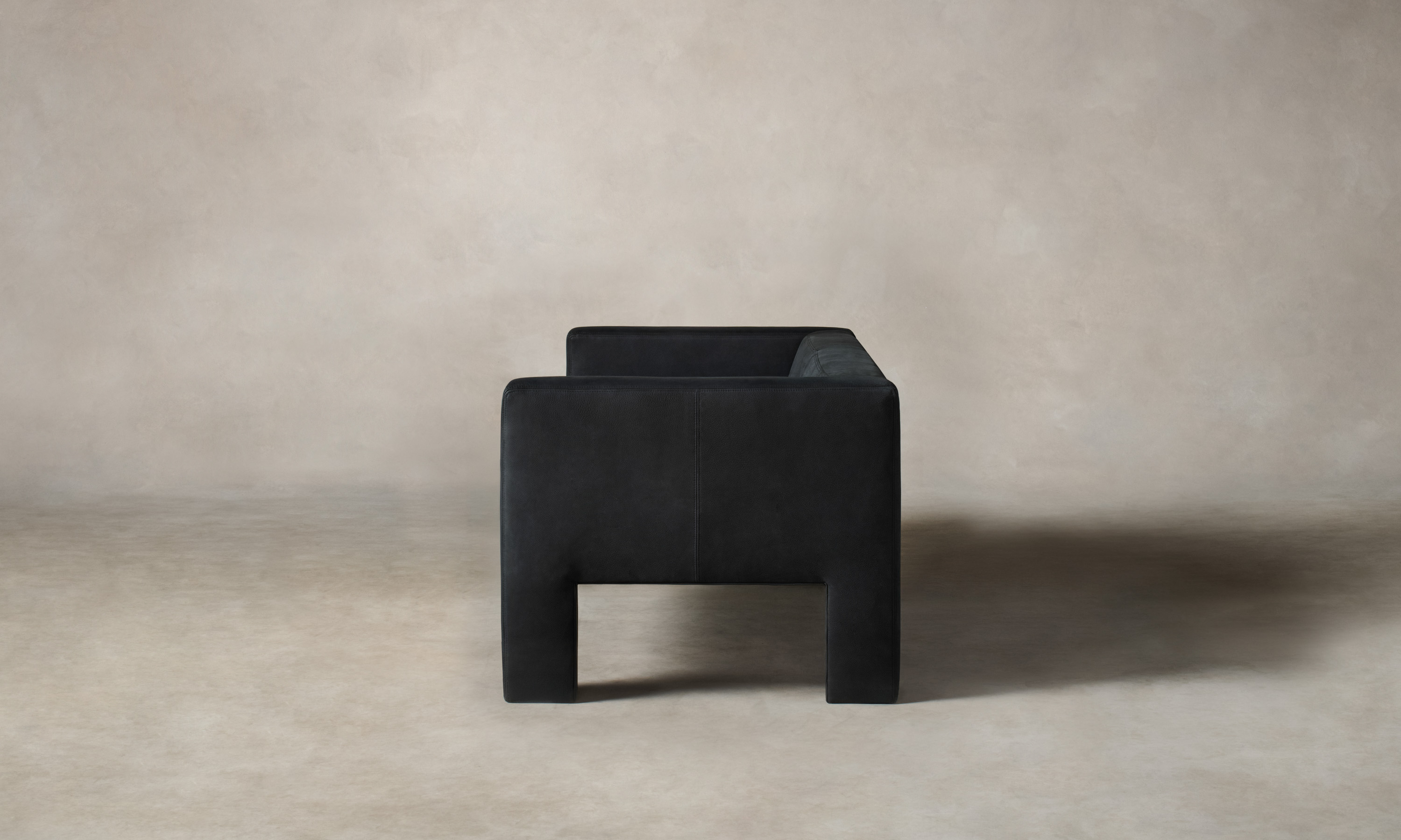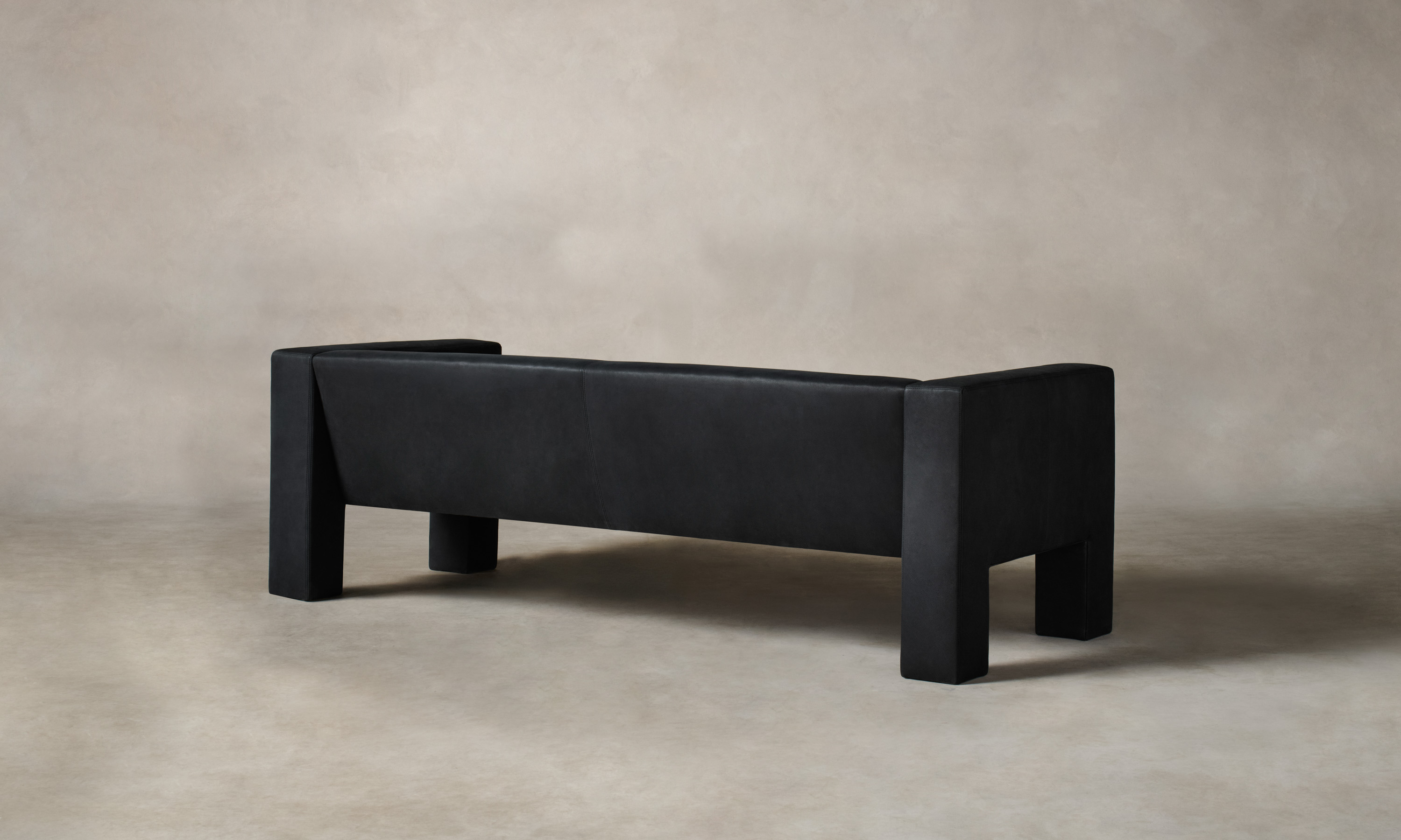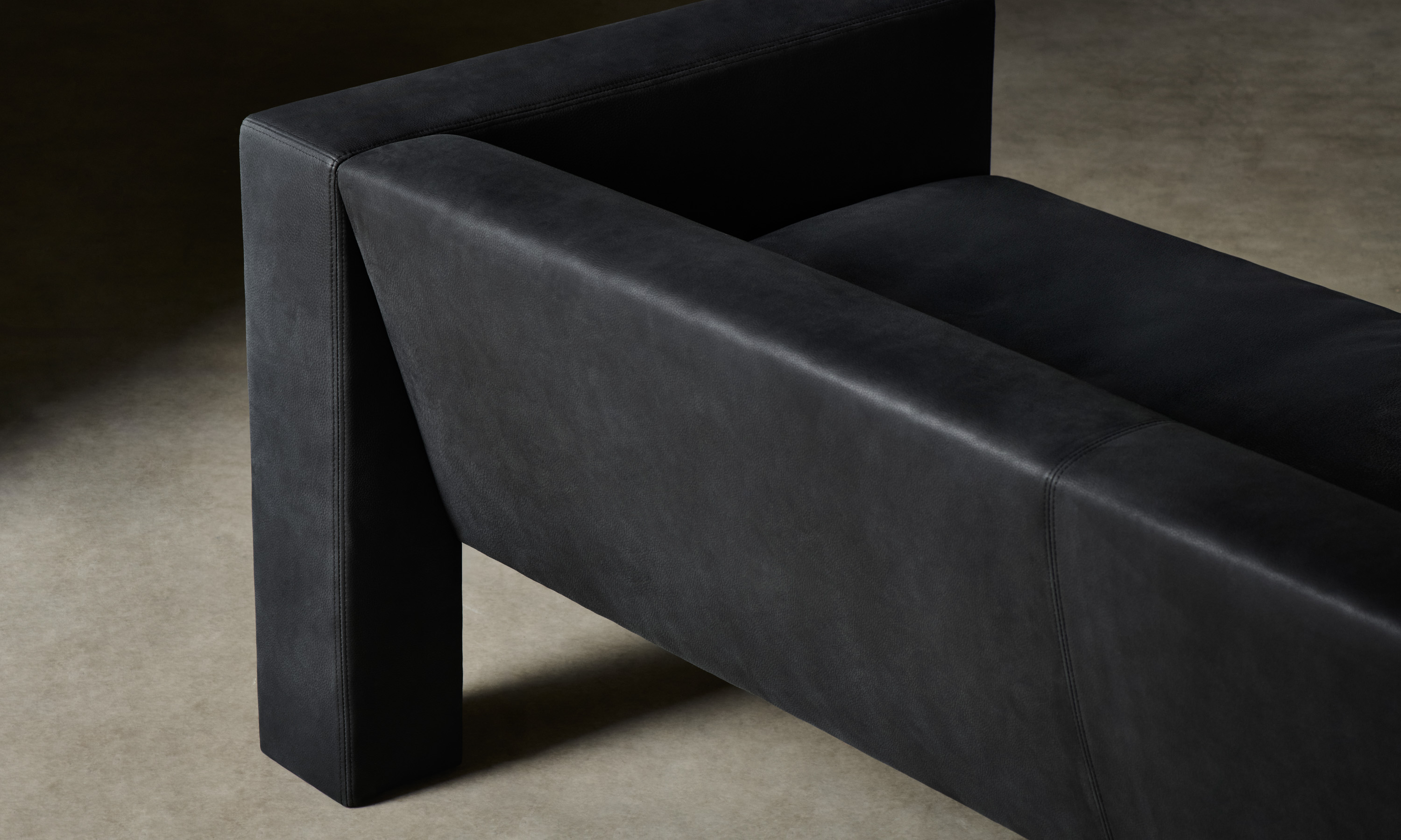 The Otto Sofa stands out for its rigid geometries. Rectangular arms extend into legs that frame a reclined seat. The contrast between the vertical and the diagonal creates deliberate visual tension. Handcrafted in North Carolina.