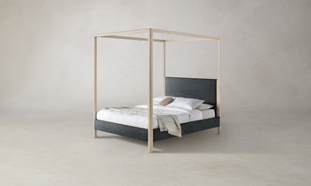 The Thompson Canopy Bed is an expression of graceful simplicity. It has an ash frame with rounded corners and neat upholstery along the headboard, foot rail, and sides, creating a perfect balance of rigidity and softness. Handcrafted in North Carolina.