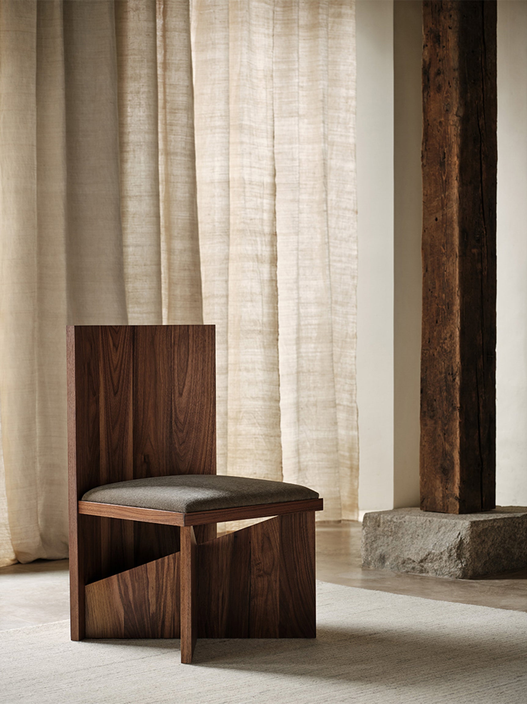 The Venice Chair is a study in contrasts. The softness of its curved back and upholstered seat is balanced by its angular base, where a void welcomes conversation between light and shadow. Handcrafted at a family-owned workroom in upstate New York.