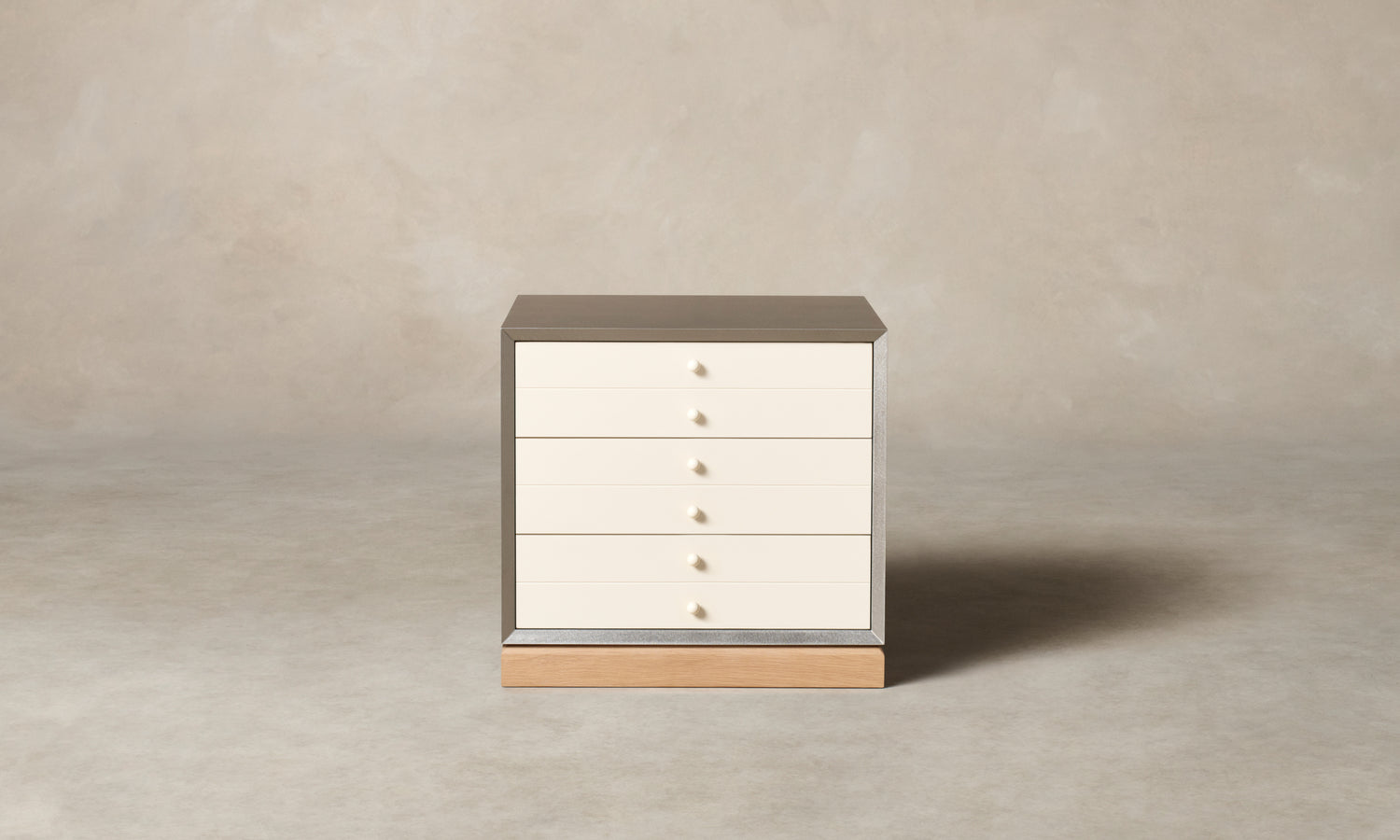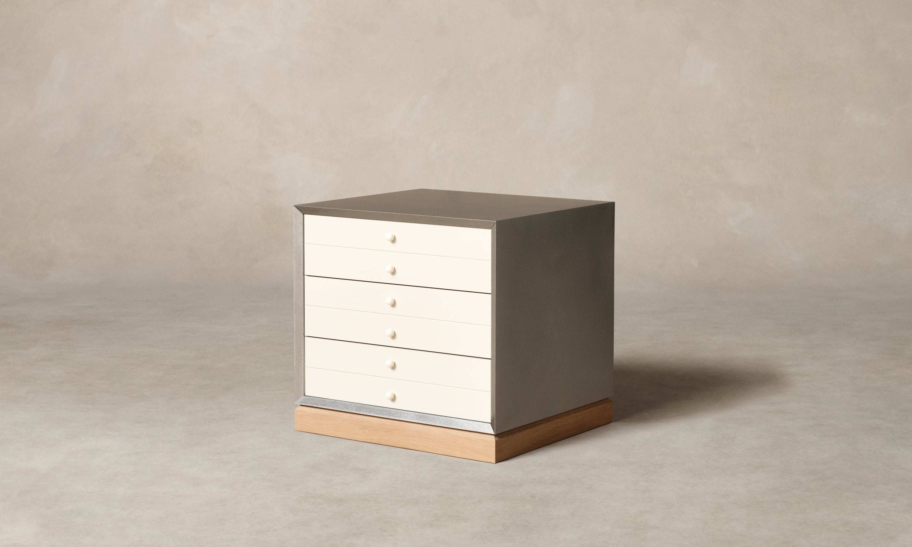 Rectilinear in form and rigid in materiality, the Verne 3-Drawer Nightstand is a bold addition to the bedside. It has a steel frame that rests atop a white oak base and lacquered drawers with tonal pulls.