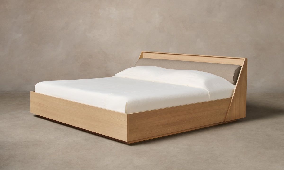 Rectilinear in form and rigid in materiality, the Verne Bed is a bold centerpiece for the bedroom. It has a white oak plywood frame and headboard accented with a contrasting bolster that adds a touch of softness. Handcrafted in New York.