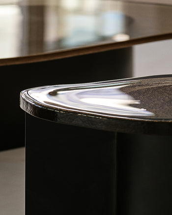 The starting point was familiar. Our Founder, Nidhi Kapur, and Design Director, Anne Weber Callahan, found a solid foundation in the Rene Accent Tables. The Rene’s cast glass tabletops embody everything we stand for: original form, fine materials, and rare craft. But rather than echo the material language of the Rene Collection, they contemplated what might happen if cast glass were made to feel jewelry-like in its expression.