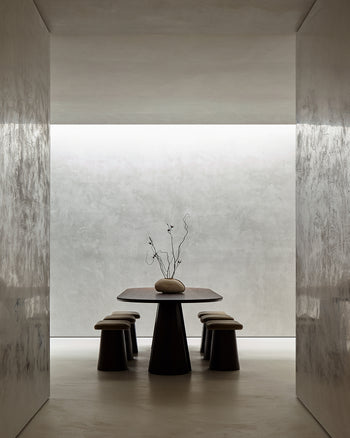 Beyond the entryway, soft light drifts across limewash and Venetian plaster walls, their quiet glow an invitation to venture further inside. And with every step across smooth cement floors, a soft echo follows—underscoring the store’s expansive calm.