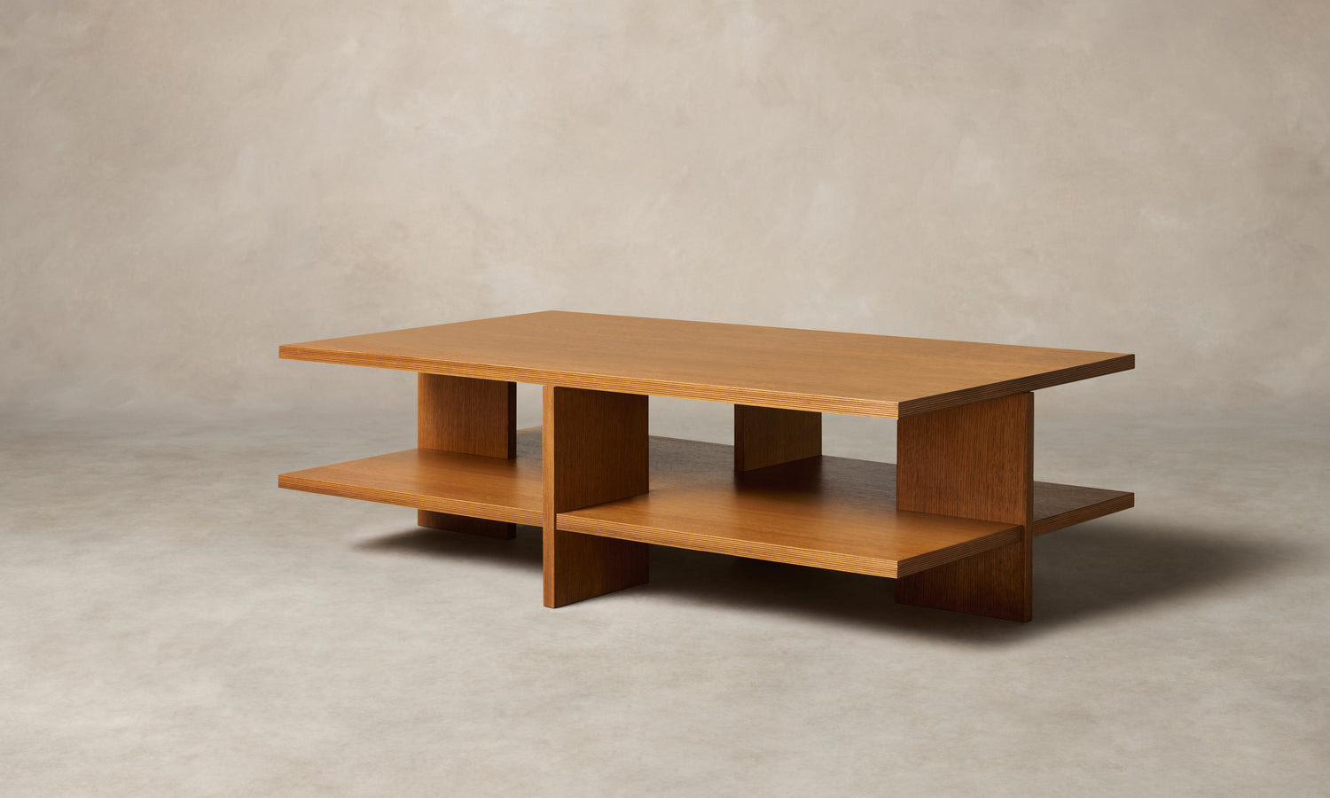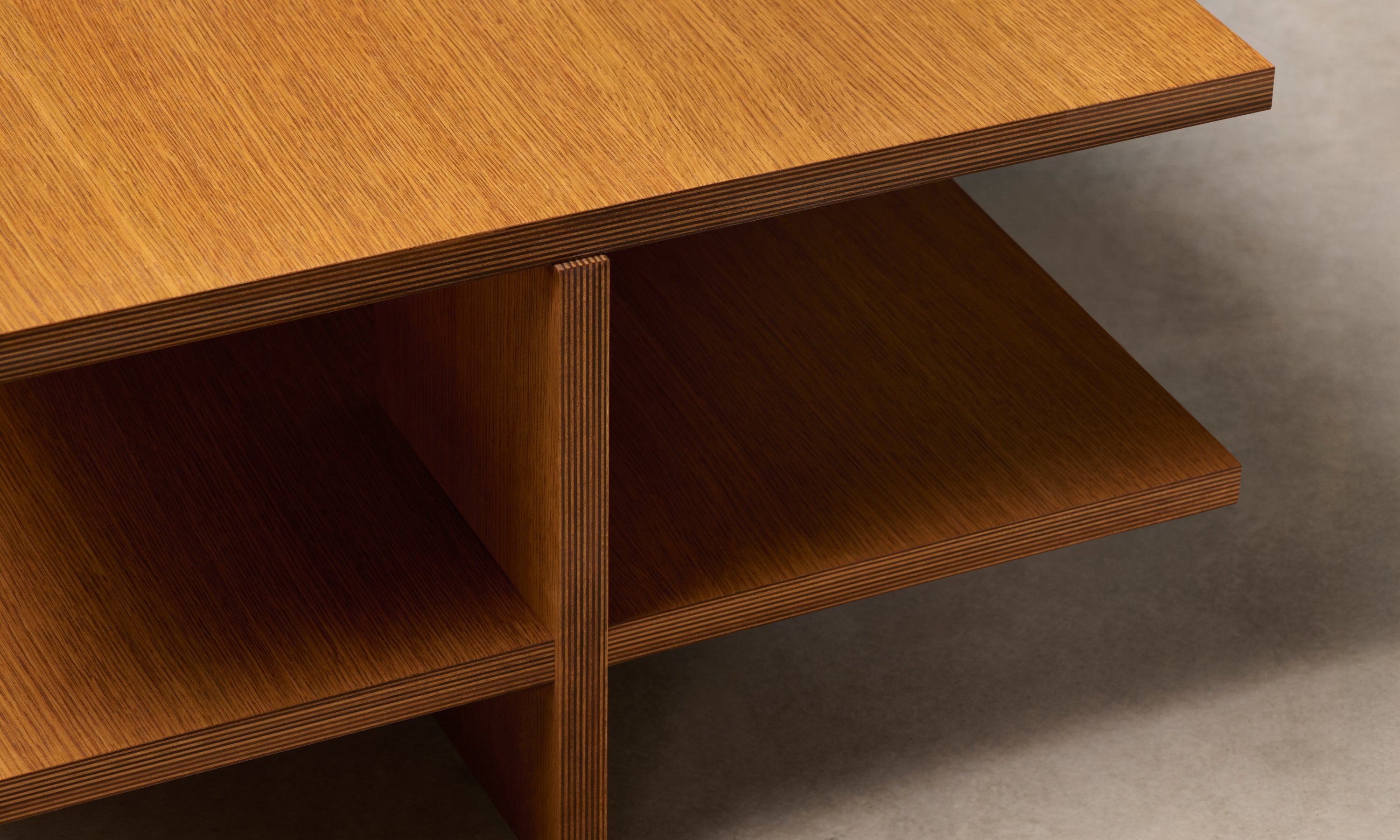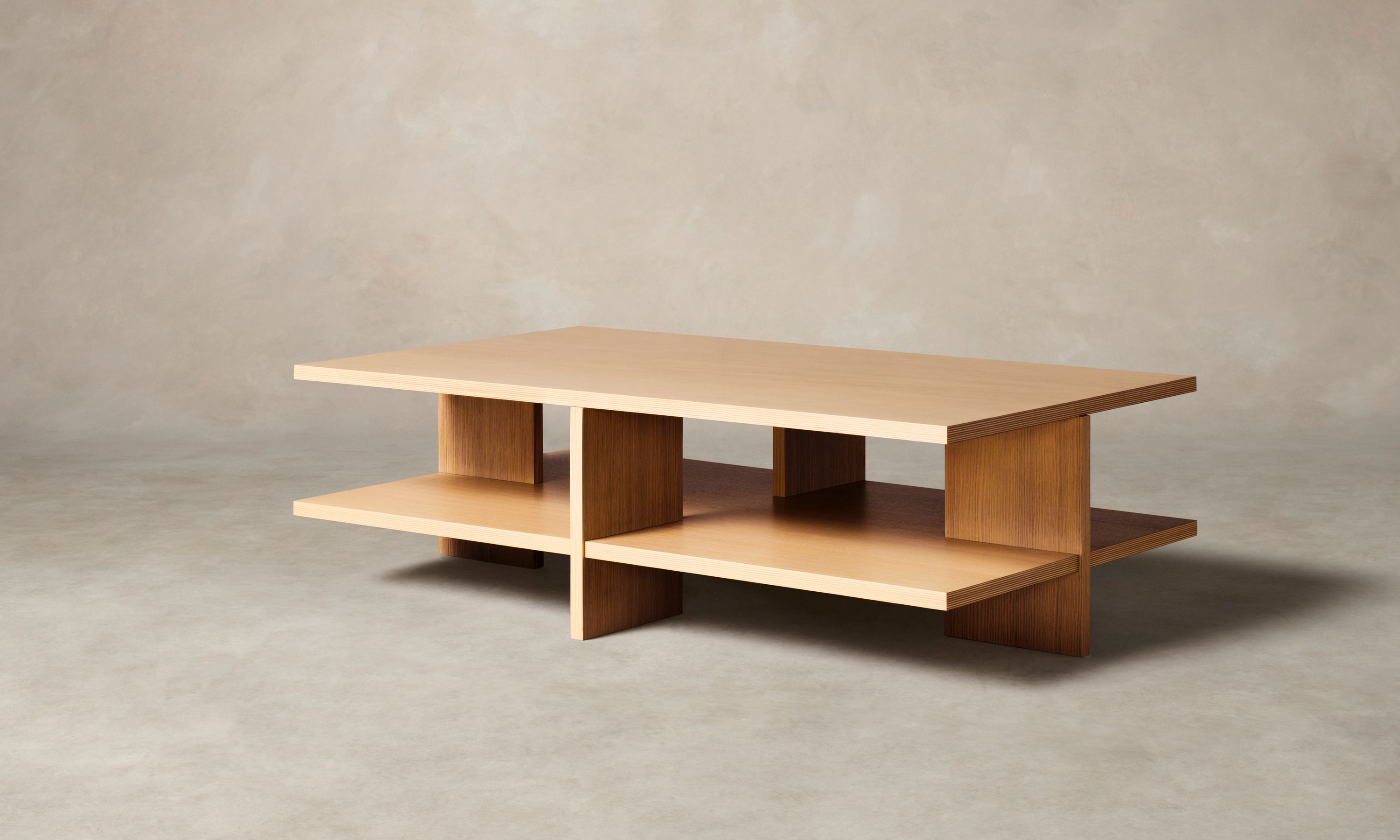 The Arte Rectangular Coffee Table transforms plywood into a sculptural object of conversation. Defined by its angular silhouette, it has two planar surfaces that create conversation between form and space. Handcrafted at a family-owned workroom in upstate New York.