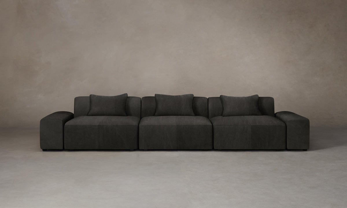 The Breuer Modular Sofa draws inspiration from the bold and graphic shapes of brutalist design. Tightly upholstered for a sleek look, it has a low-lying seat accompanied by plush throw pillows. Handcrafted in North Carolina.
