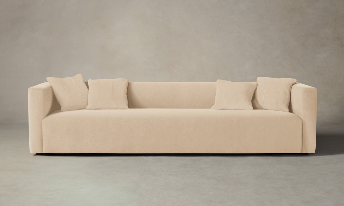 The Breuer Sofa draws inspiration from the bold and graphic shapes of brutalist design. Tightly upholstered for a sleek look, it has a low-lying seat accompanied by plush throw pillows. Handcrafted in North Carolina.
