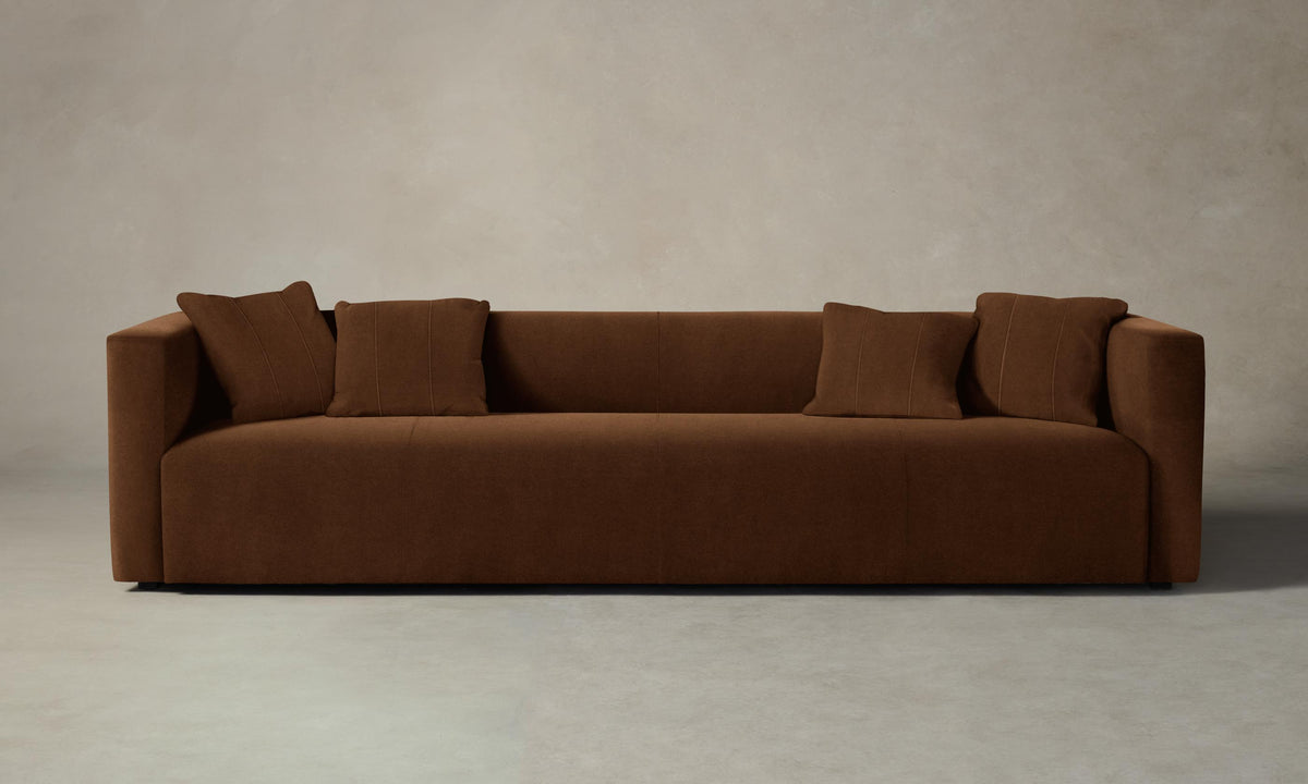 The Breuer Sofa draws inspiration from the bold and graphic shapes of brutalist design. Tightly upholstered for a sleek look, it has a low-lying seat accompanied by plush throw pillows. Handcrafted in North Carolina.