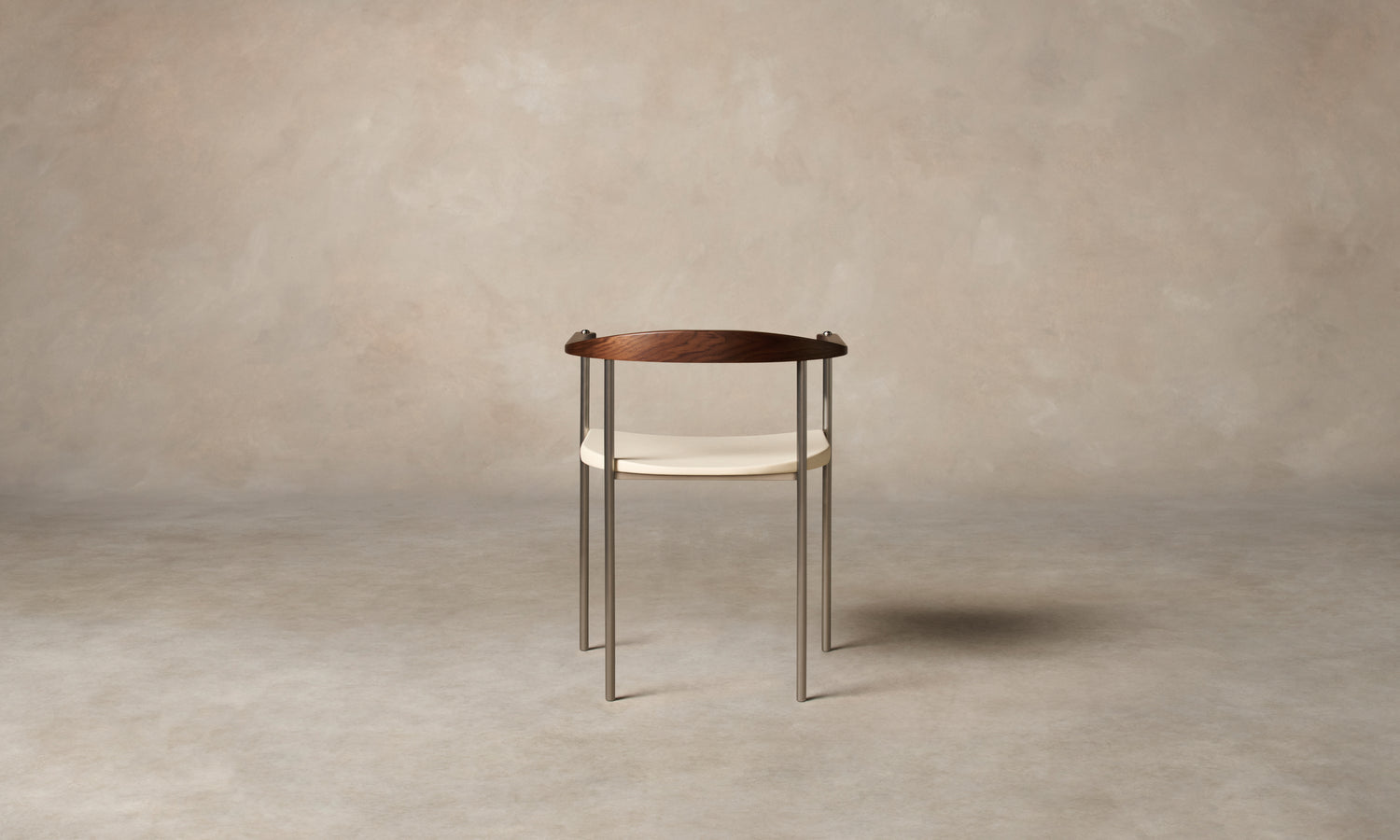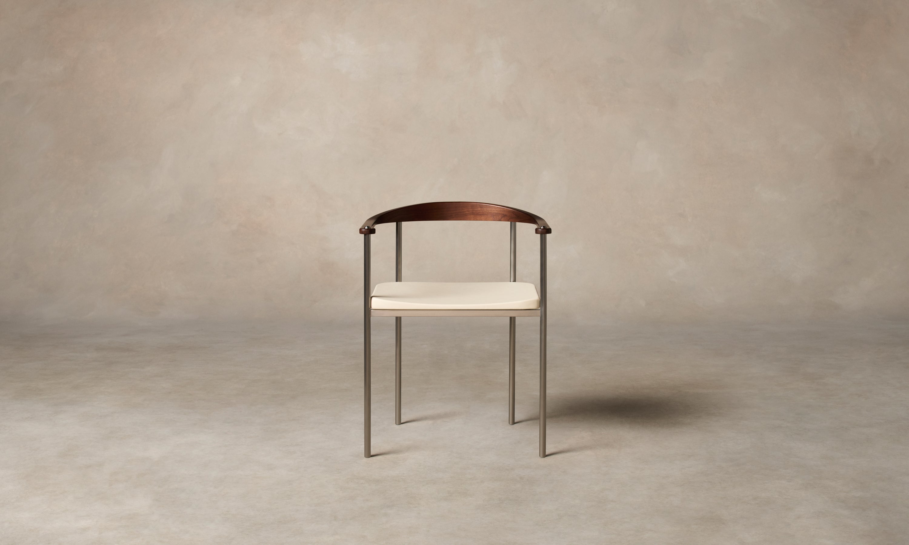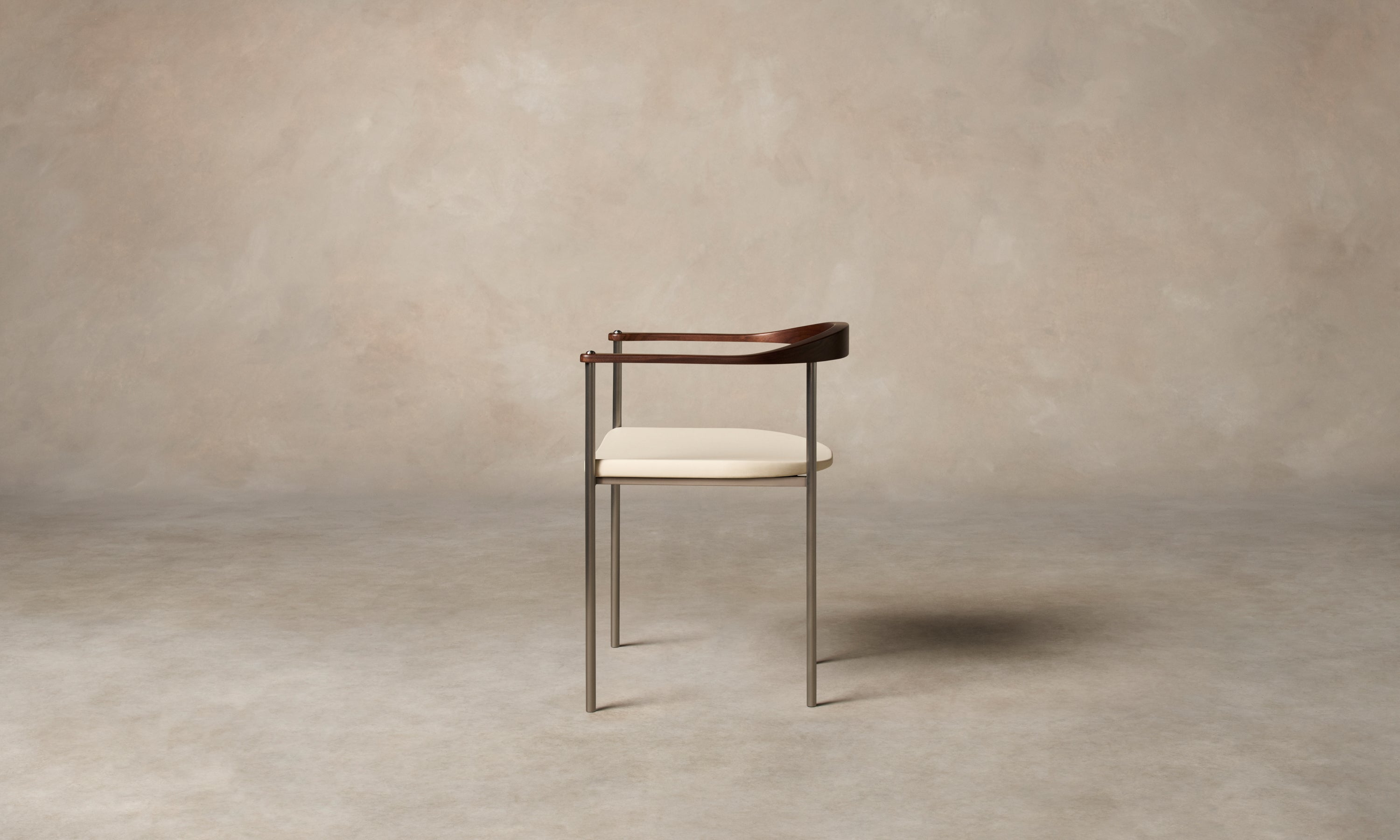In the Calder Dining Armchair, cold-rolled steel, leather, and wood come together as one sleek silhouette. It has a hand-brushed frame with bent walnut arms and a seat wrapped in fine hides.
