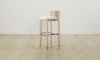 The Delancey Bar & Counter Stool brings depth and dimension into your space with its mixed materiality. Made from ash, it has an elegantly curved back, upholstered seat, and metal footrest. Handcrafted in North Carolina.