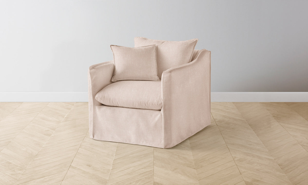 The Dune Swivel Chair is a vision of effortlessness and ease. It boasts a deep seat, plush cushioning, and relaxed slipcover with hand-sewn flange seams for an elegant finish. Handcrafted in North Carolina.
