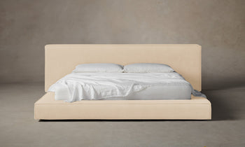 The Eldridge Bed establishes a laid-back ambience in the bedroom with its low-lying silhouette and generous proportions. Fully upholstered and cushioned all around, it has an extended headboard and linear form traced with flange seams. Handcrafted in North Carolina.