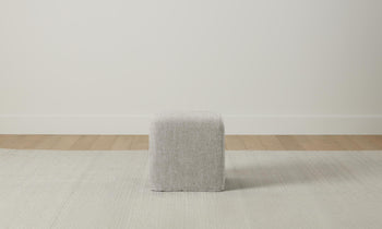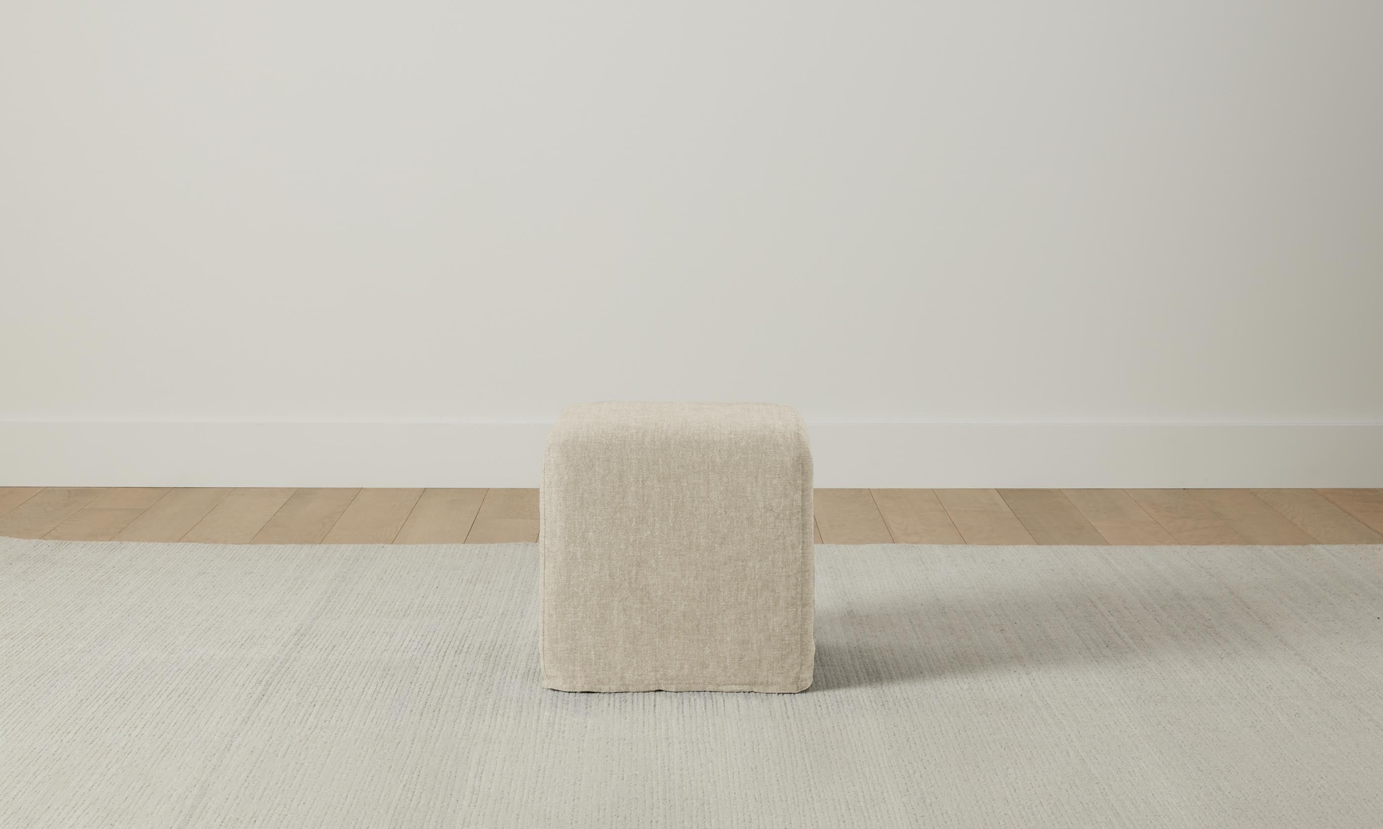 The Franklin Ottoman is distinguished by its simplicity. It has an understated silhouette with a cushioned seat and hand-sewn slipcover that drapes softly to the floor. Handcrafted in North Carolina.