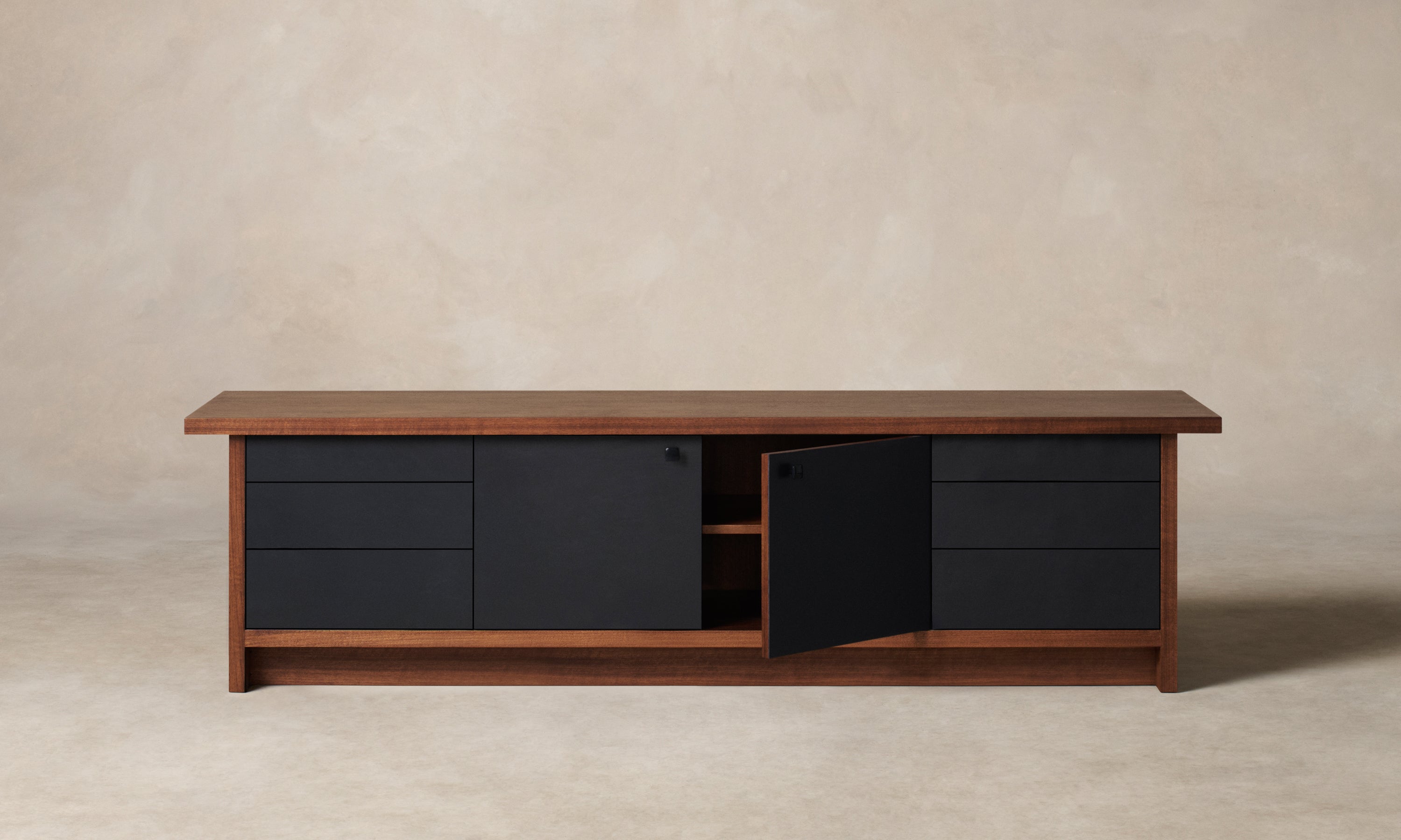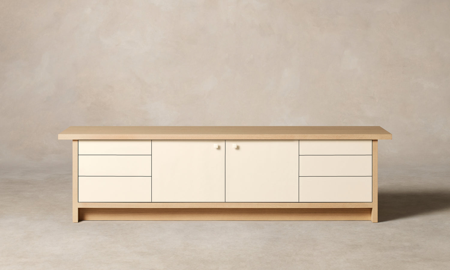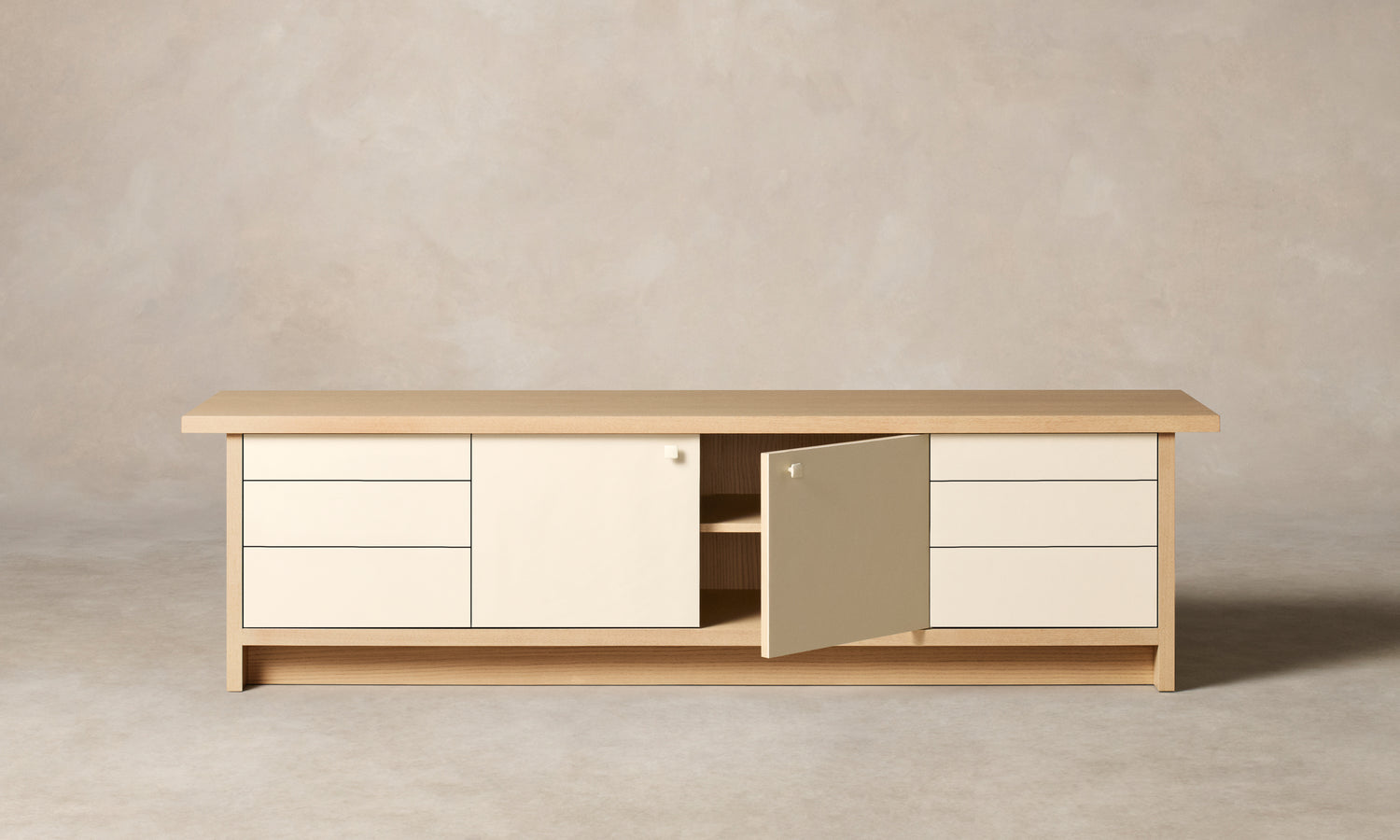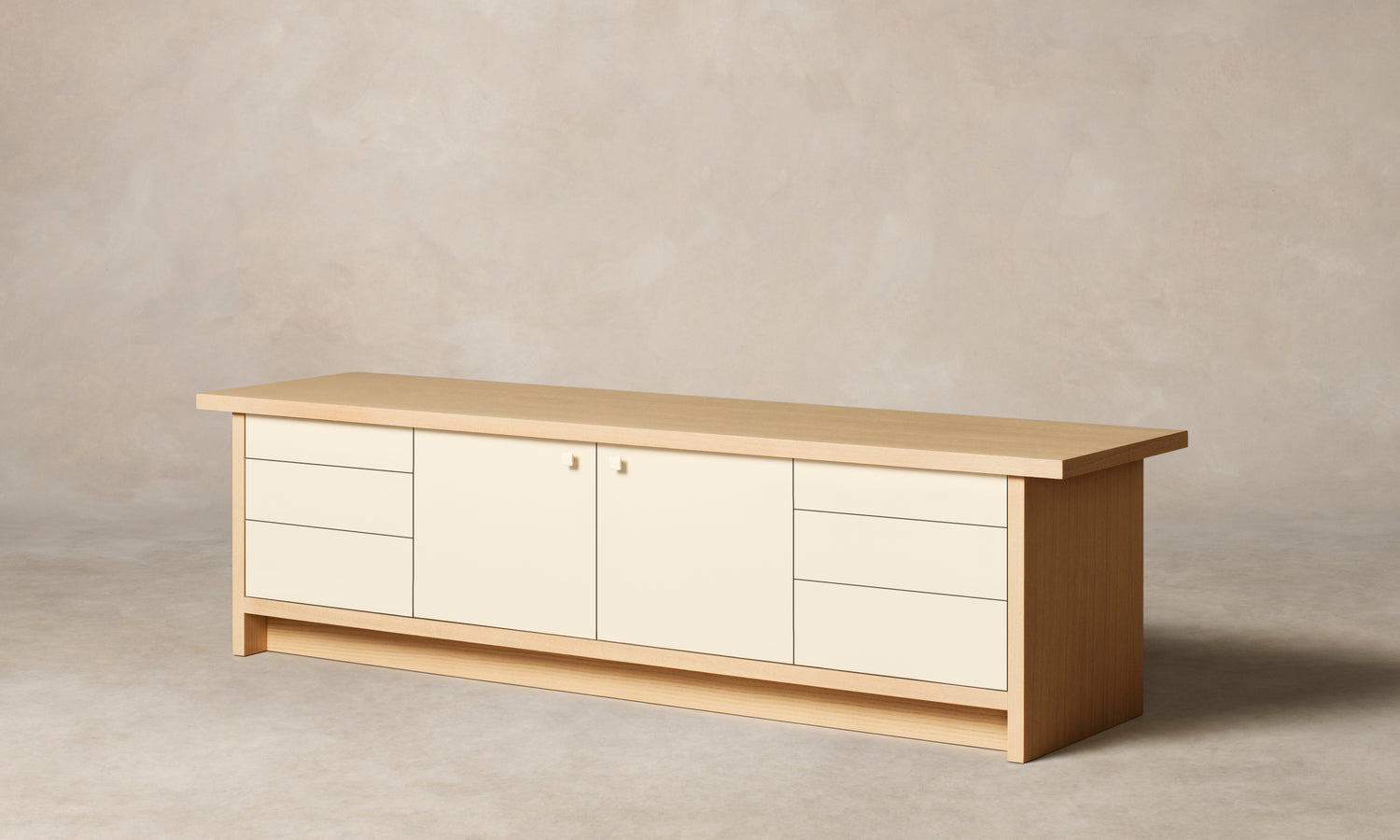 The Jeanne Console marries a mid-century form with a contemporary mixture of materials. Available in white oak or walnut, its angular façade is wrapped in smooth Alpine Leather and accented with enameled pulls. Handcrafted in New York.