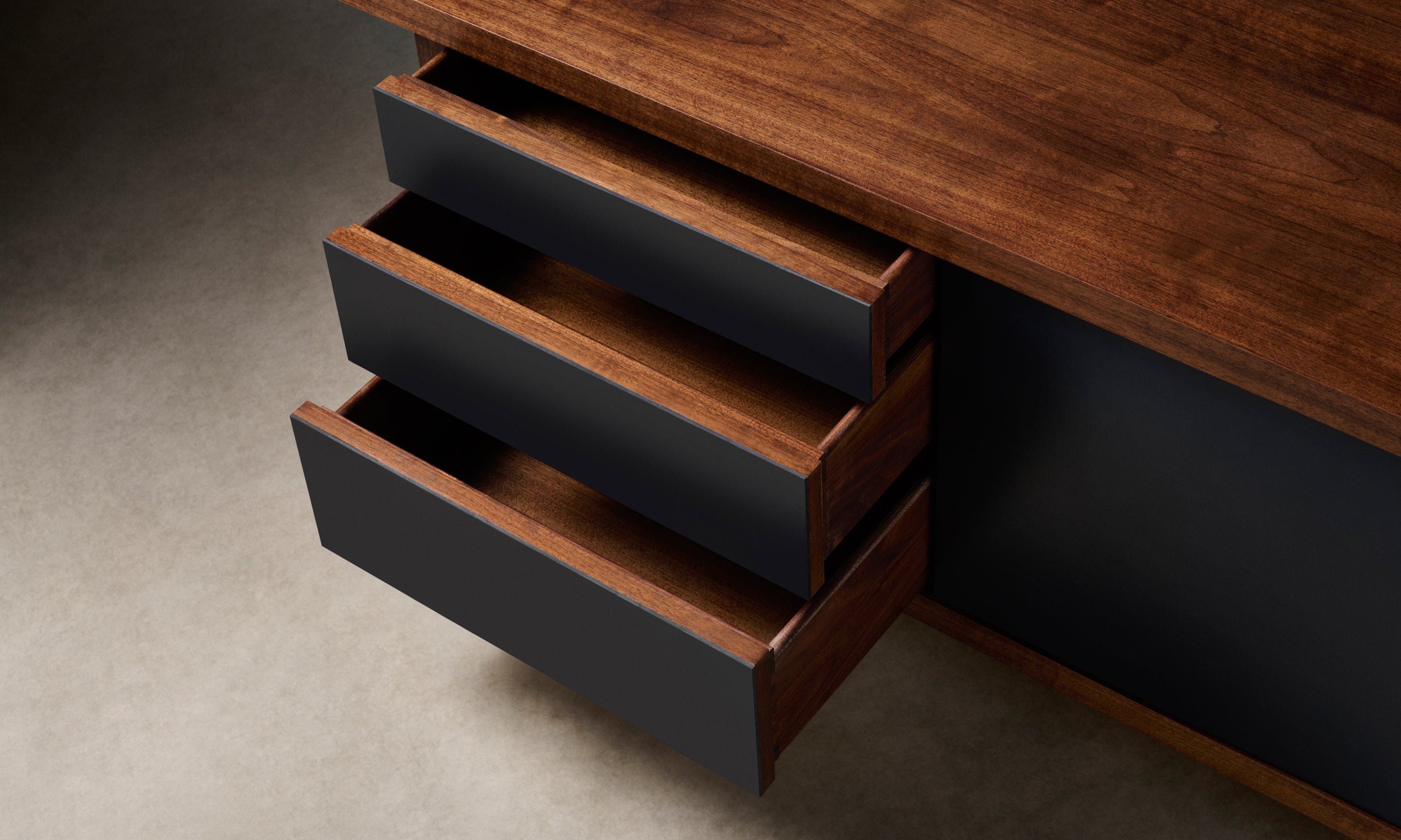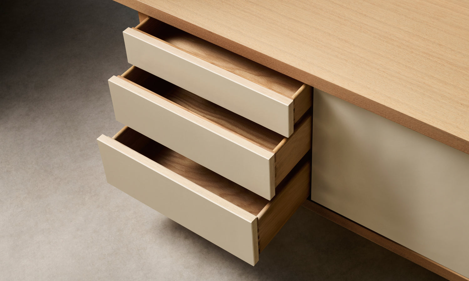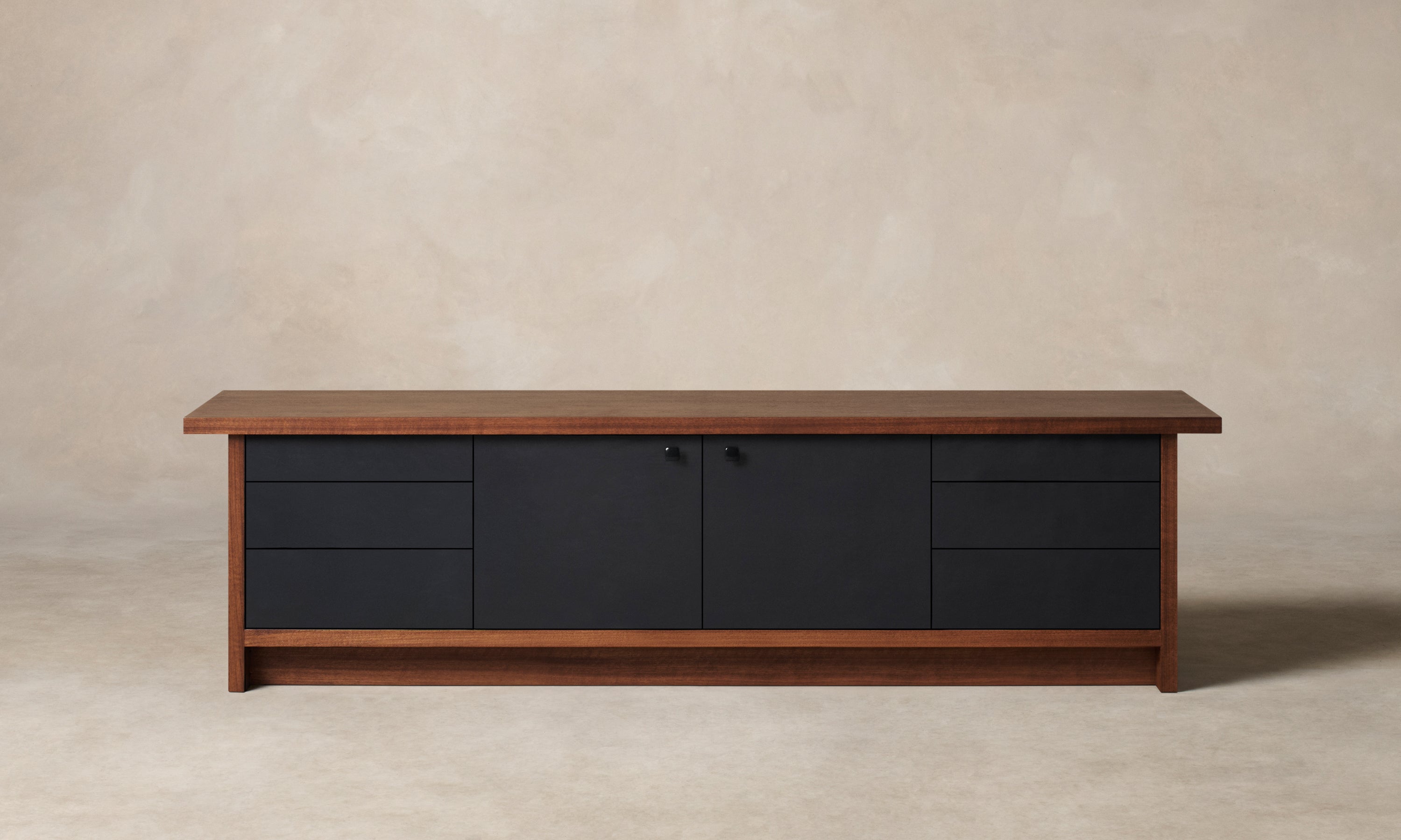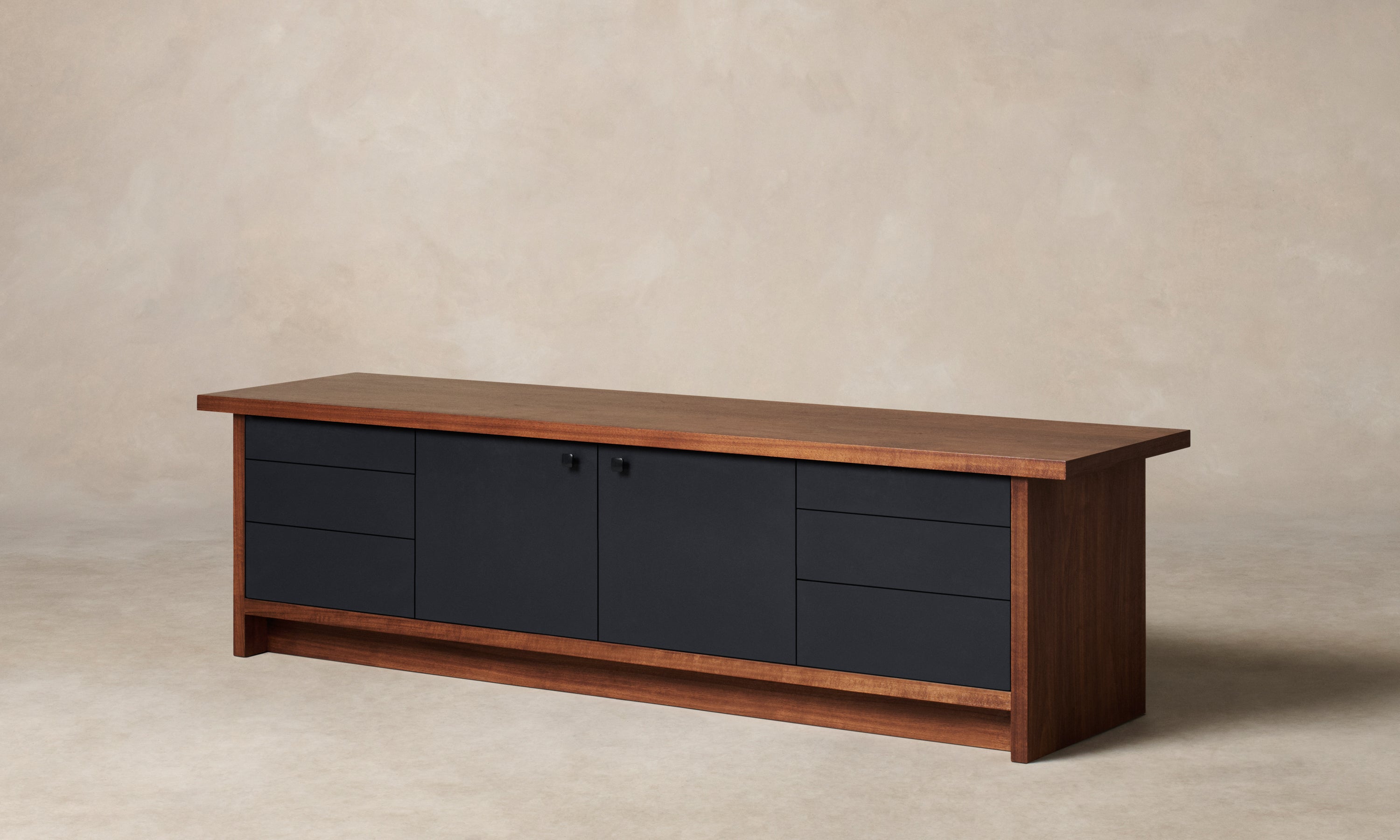 The Jeanne Console marries a mid-century form with a contemporary mixture of materials. Available in white oak or walnut, its angular façade is wrapped in smooth Alpine Leather and accented with enameled pulls. Handcrafted in New York.