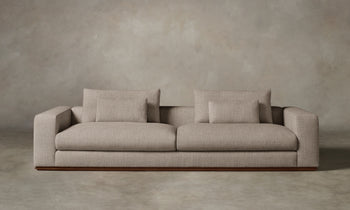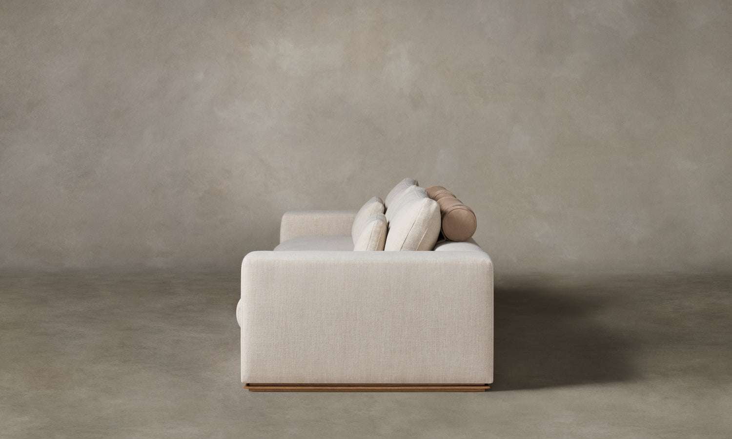 Marrying Italian modernist form with enveloping comfort, the Nicola Sofa invites total relaxation. It has a low back with plush down cushions supported by bolsters and rests atop a sleek plinth base. Handcrafted in North Carolina.