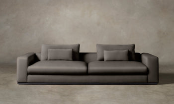 Marrying Italian modernist form with enveloping comfort, the Nicola Sofa invites total relaxation. It has a low back with plush down cushions supported by bolsters and rests atop a sleek plinth base. Handcrafted in North Carolina.