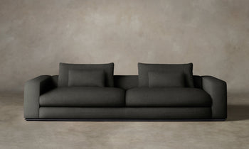 Marrying Italian modernist form with enveloping comfort, the Nicola Sofa invites total relaxation. It has a low back with plush down cushions supported by bolsters and rests atop a sleek plinth base. Handcrafted in North Carolina.