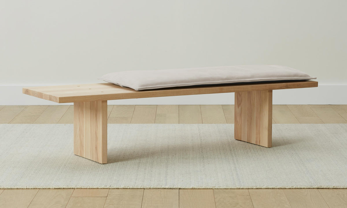 The Reyes Bench underscores the allure of honest materials. Its linear ash seat is detailed with brass insets that add touches of warmth, while the optional Nubuck Leather cushion offers a sumptuous layer of softness. Handcrafted in North Carolina.