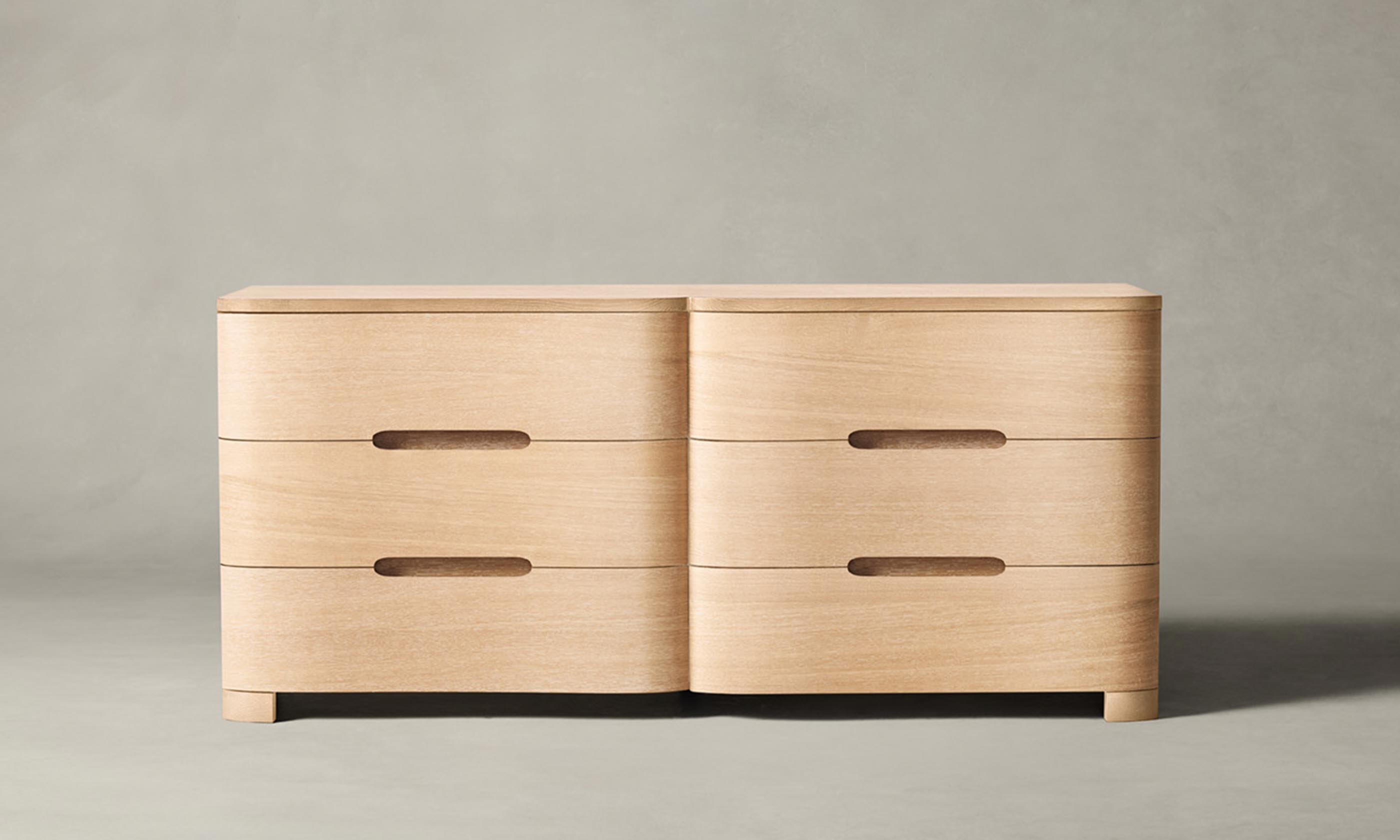 The Rivington 6-Drawer Dresser pays tribute to postmodernism with its liquid curves and contours. The design is enveloped in cerused white oak veneer that underscores the softness of the silhouette. Handcrafted at a family-owned workroom in upstate New York.