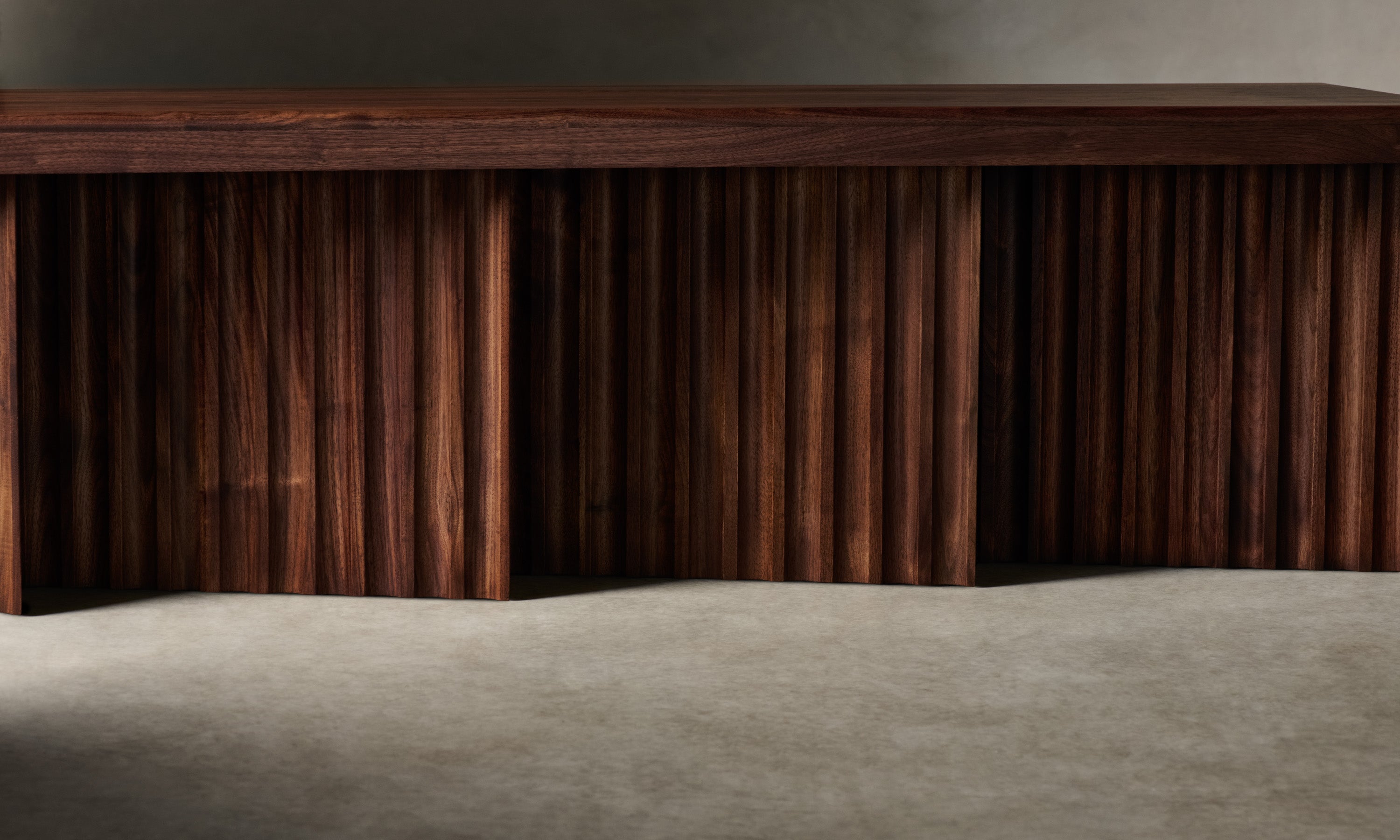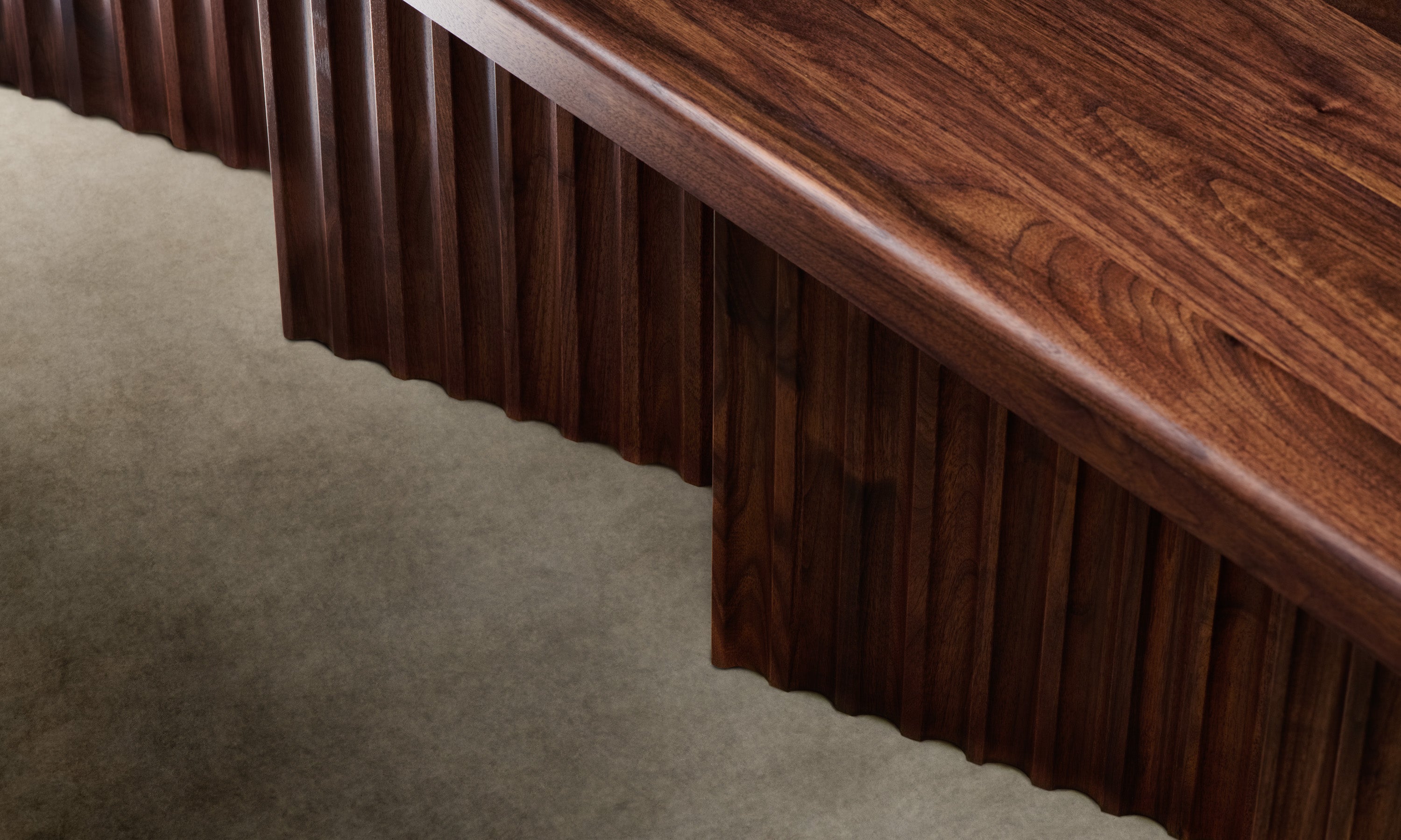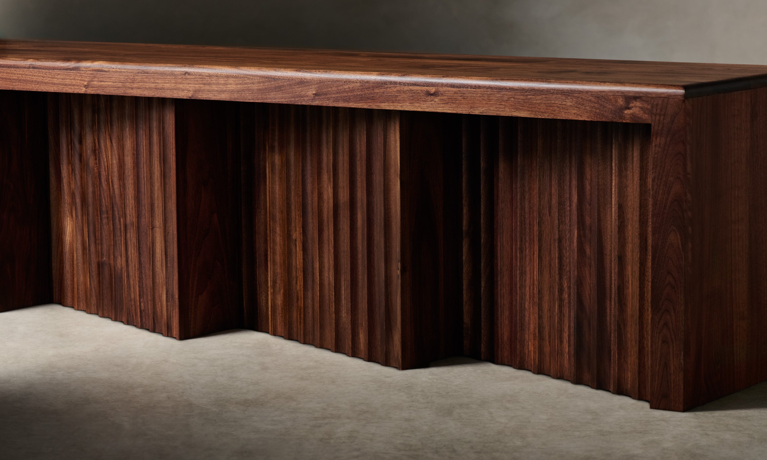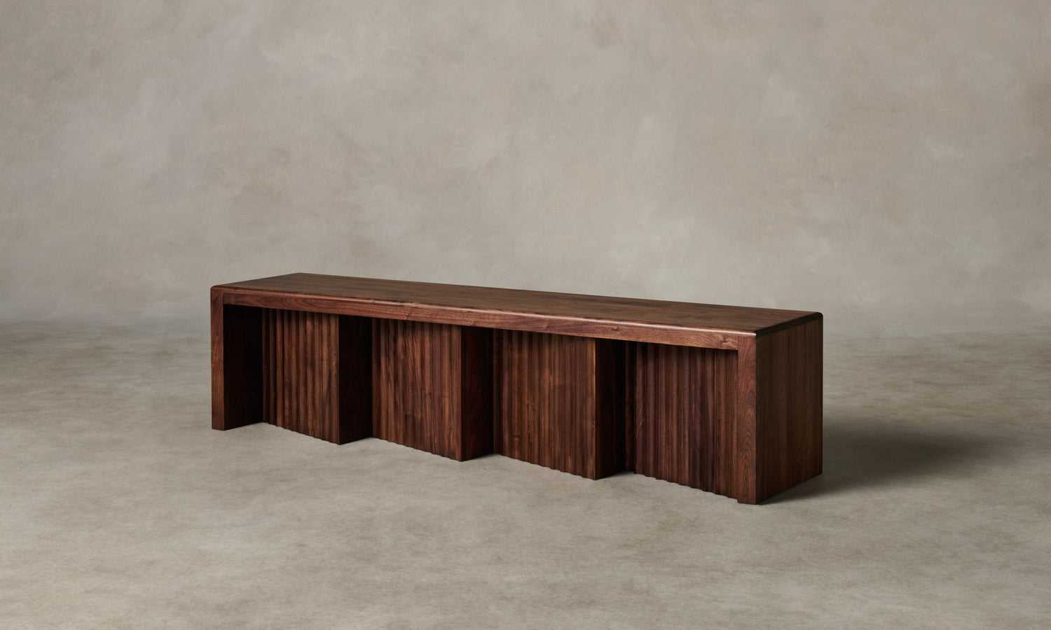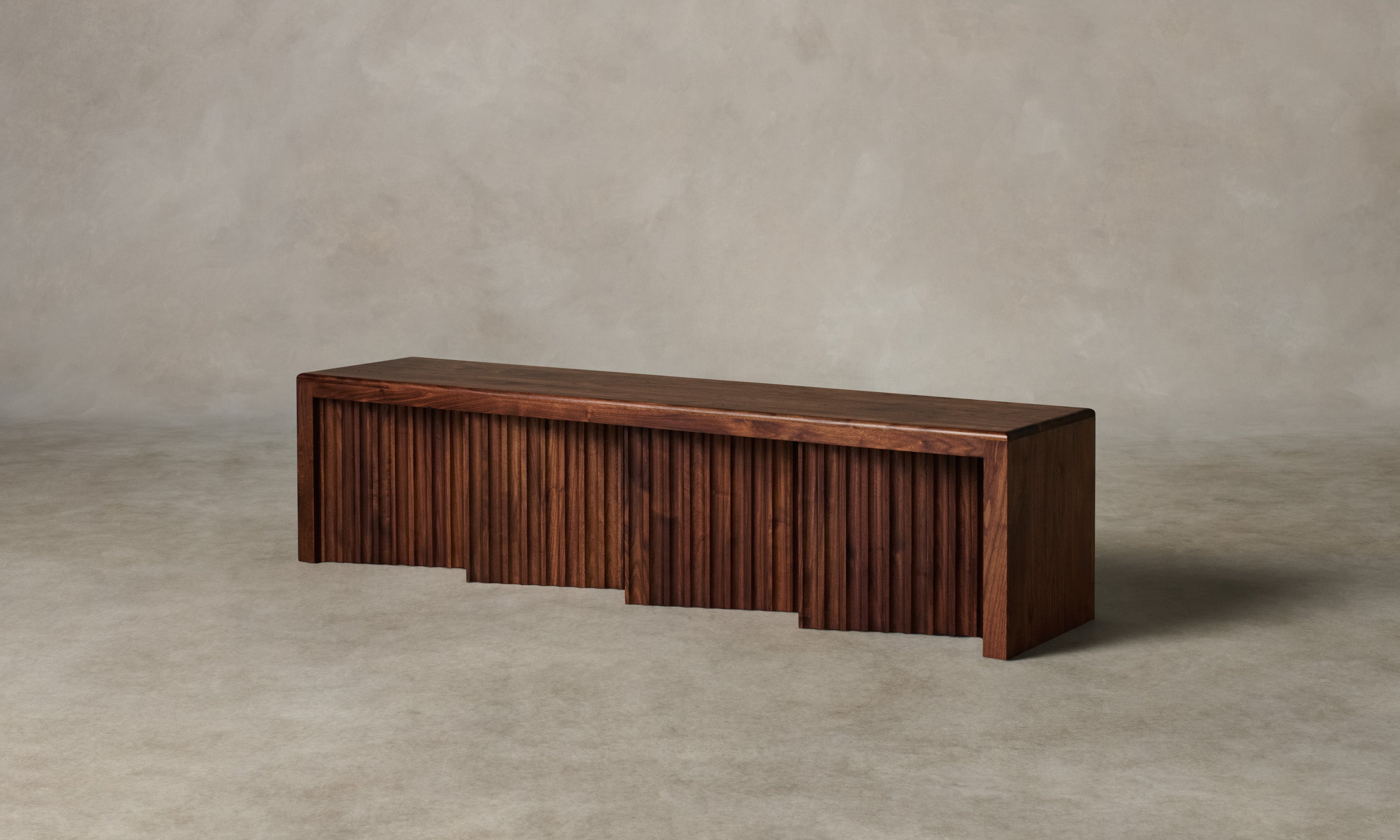 The Shadow Bench is a display of repetition in form. It is grounded by four planes of white oak or walnut, each fluted and positioned at a diagonal to create contrast between light and dark. Handcrafted at a family-owned workroom in upstate New York.