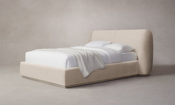 With its voluminous form and sweeping curves, the Smith Bed is a statement piece for the bedroom. Its enveloping shelter headboard and frame are fully upholstered and set upon a plinth base. Handcrafted in North Carolina.