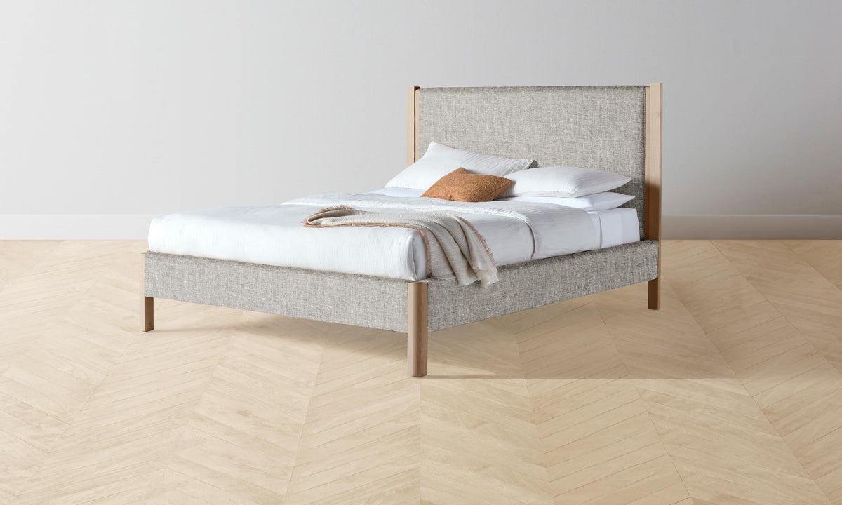 The Thompson Bed is an expression of graceful simplicity. It has an ash frame with rounded corners and neat upholstery along the headboard, foot rail, and sides, creating a perfect balance of rigidity and softness. Handcrafted in North Carolina.