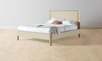 The Thompson Bed is an expression of graceful simplicity. It has an ash frame with rounded corners and neat upholstery along the headboard, foot rail, and sides, creating a perfect balance of rigidity and softness. Handcrafted in North Carolina.