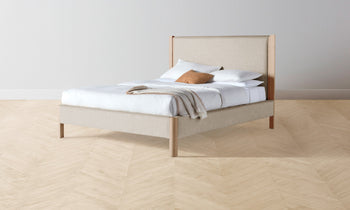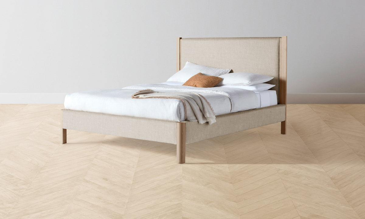 The Thompson Bed is an expression of graceful simplicity. It has an ash frame with rounded corners and neat upholstery along the headboard, foot rail, and sides, creating a perfect balance of rigidity and softness. Handcrafted in North Carolina.