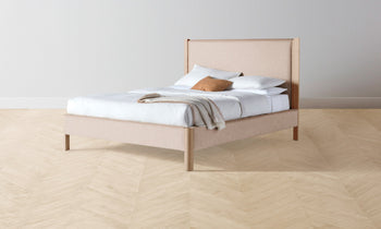 The Thompson Bed is an expression of graceful simplicity. It has an ash frame with rounded corners and neat upholstery along the headboard, foot rail, and sides, creating a perfect balance of rigidity and softness. Handcrafted in North Carolina.