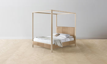 The Thompson Canopy Bed is an expression of graceful simplicity. It has an ash frame with rounded corners and neat upholstery along the headboard, foot rail, and sides, creating a perfect balance of rigidity and softness. Handcrafted in North Carolina.